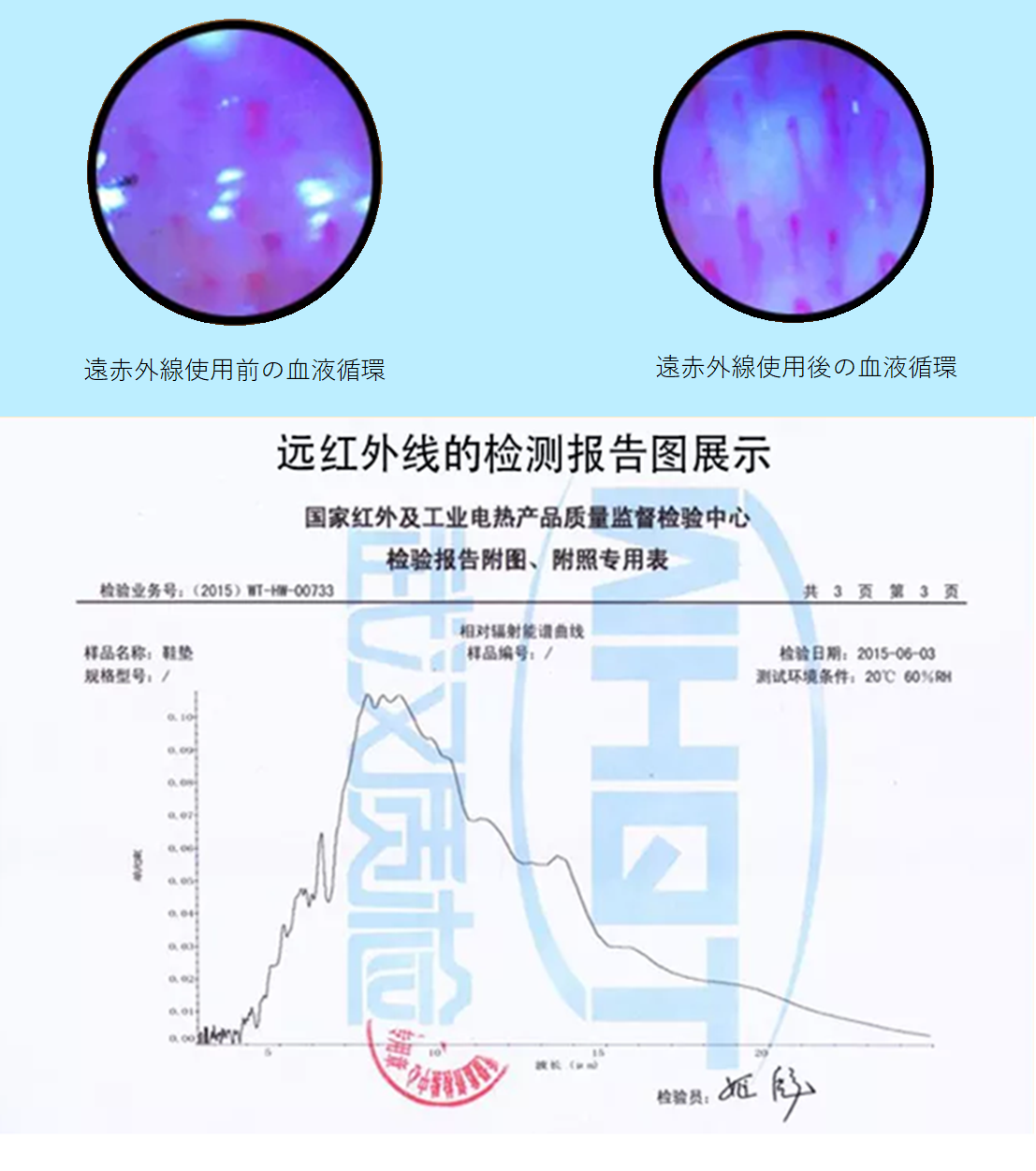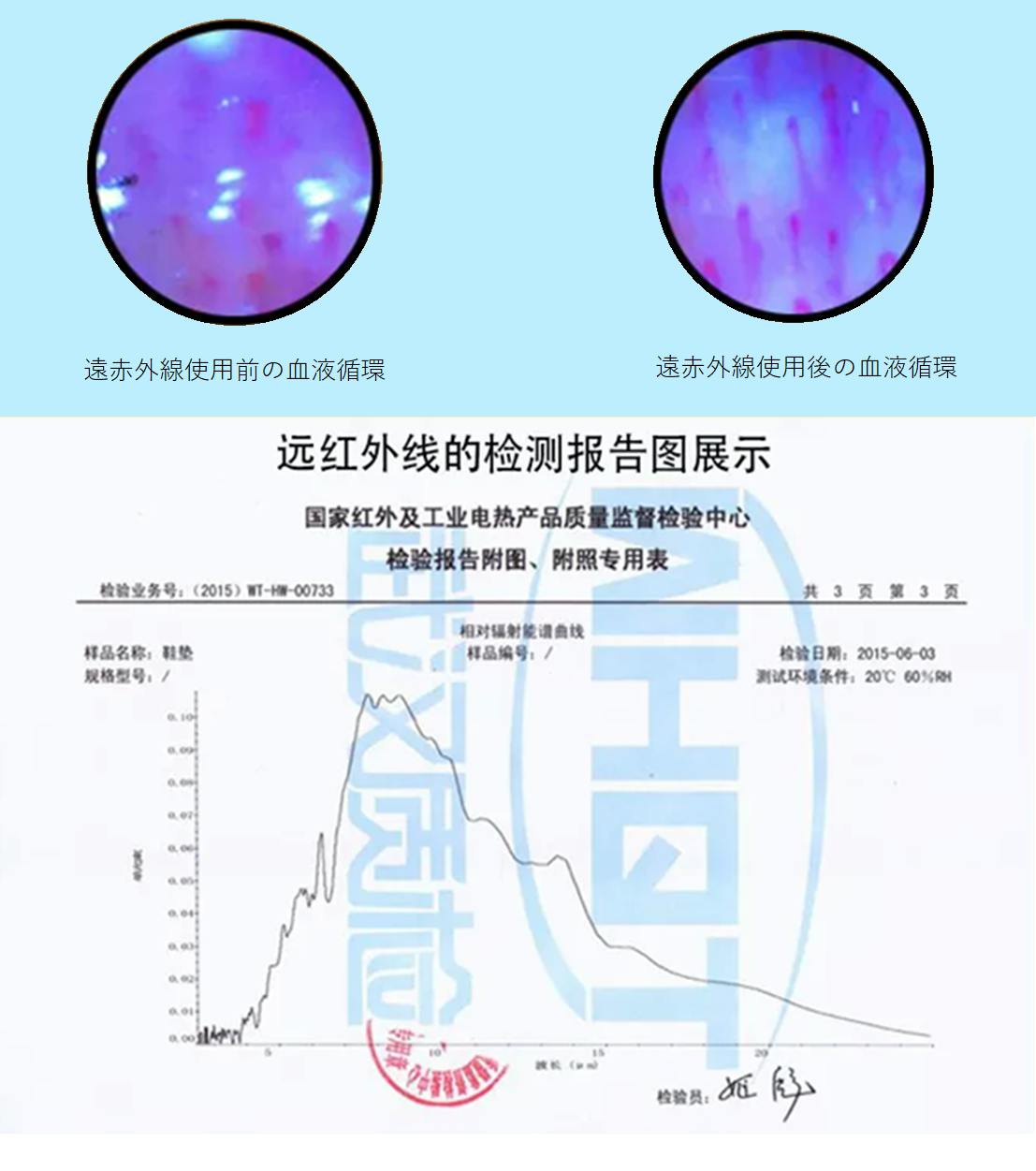以下は公的試験機関(中国国家検査センター)による遠赤外線検査結果です。 グラフは相対放射スペクトル曲線となります。