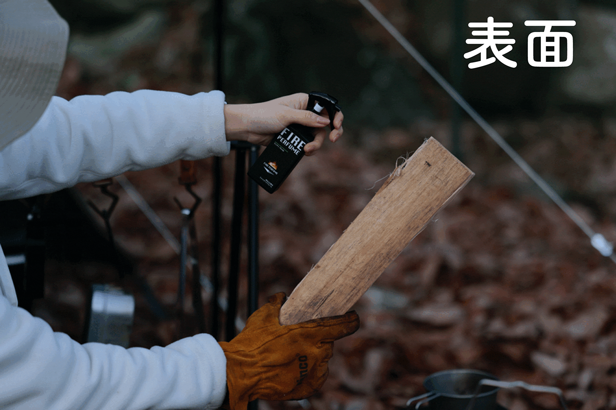 薪に「焚き火の香水」を吹き付けたら、吹き付けた面のいずれかを下にして焚き火に入れてください。吹き付けた面を下にすることがより香りを楽しむポイントです。
