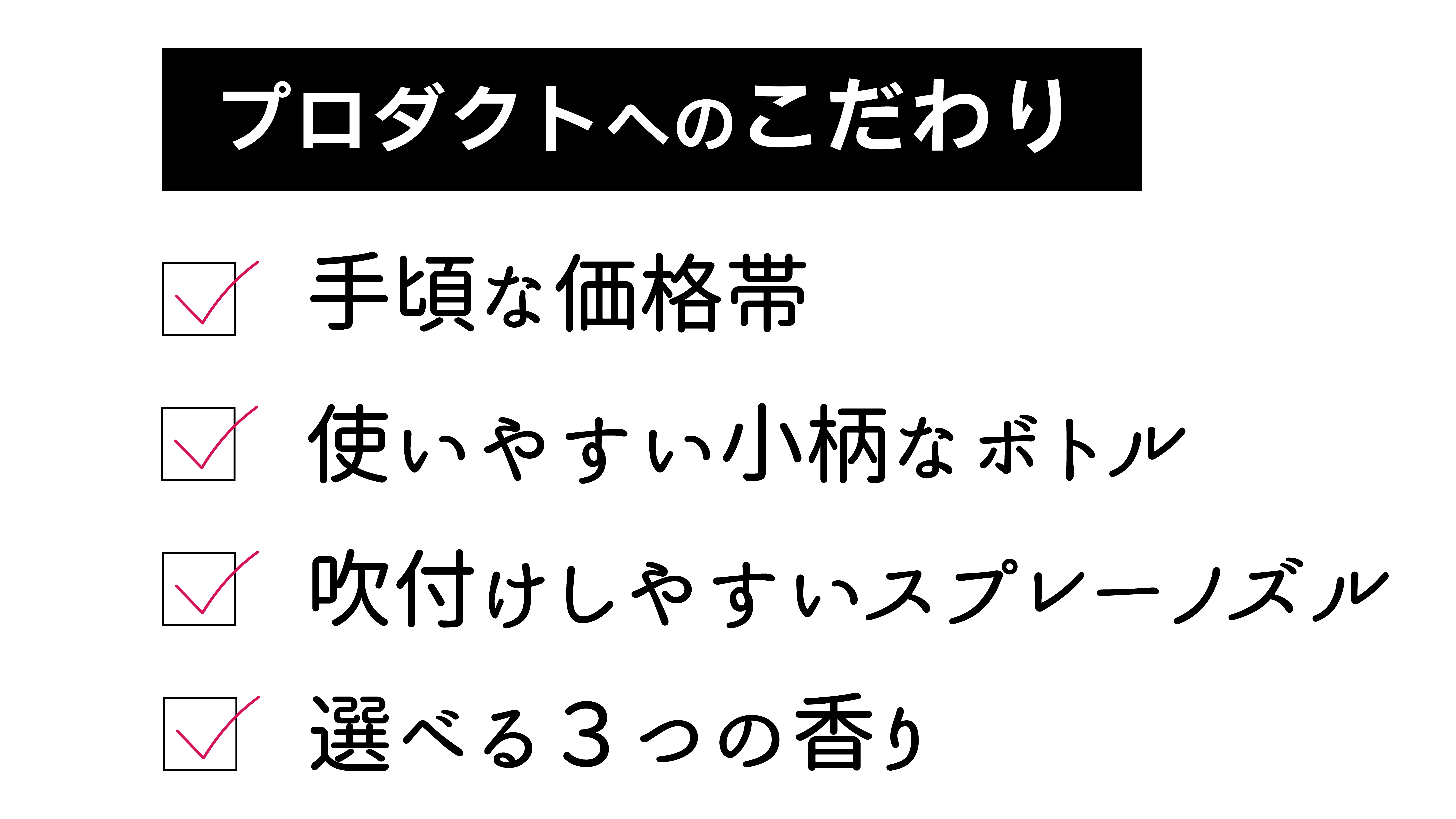 また、この開発には、長年香りの製品製造を行う国内の化粧品工場の協力をいただき、こだわり抜いた香りをお求めやすい価格に、また使いやすいボトル、吹付けに最適なスプレーにする事ができました。