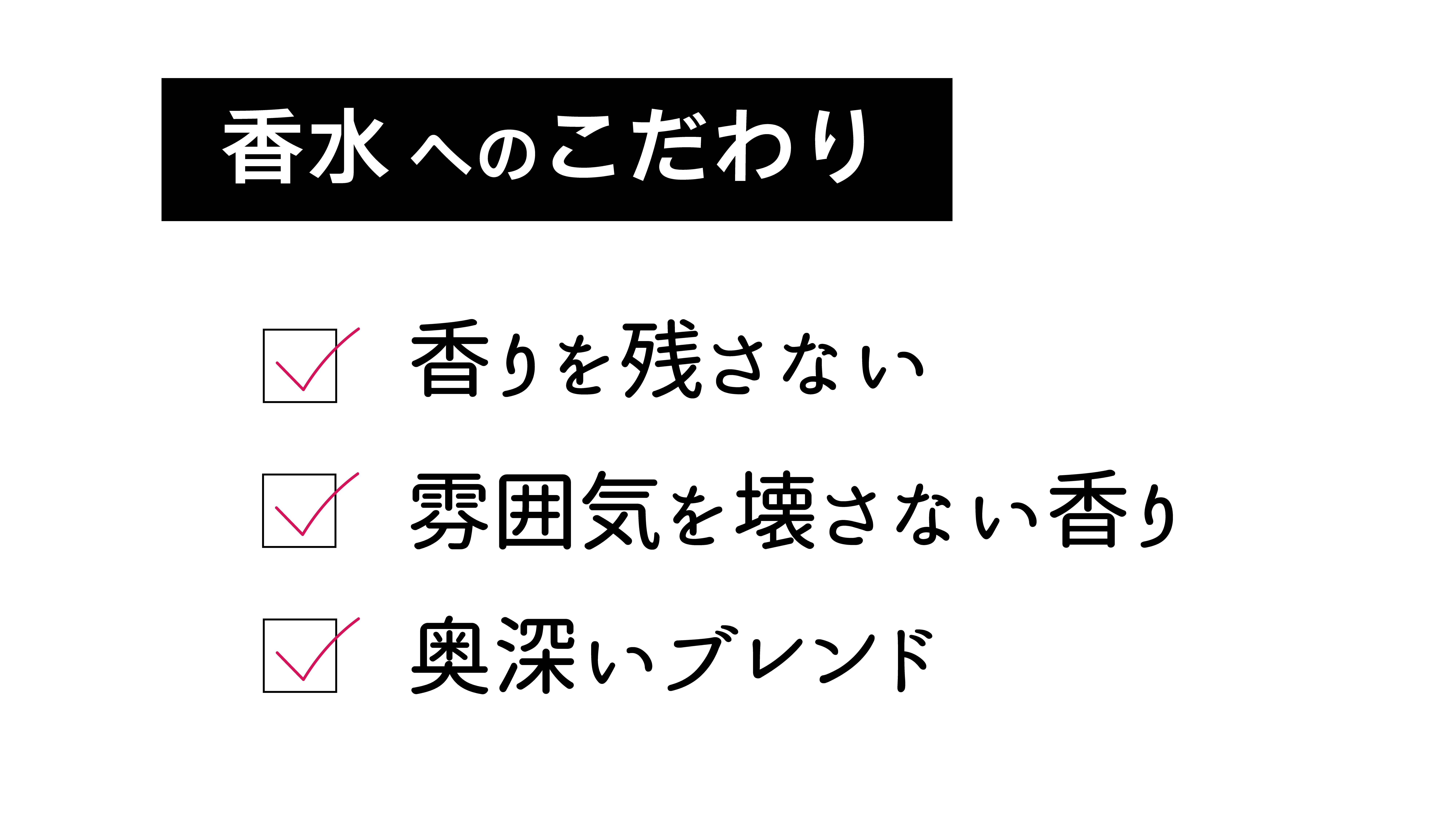 香りの種類:フルーティ(カシス系)ローズ、ウッディ(ヒノキ系)の3種