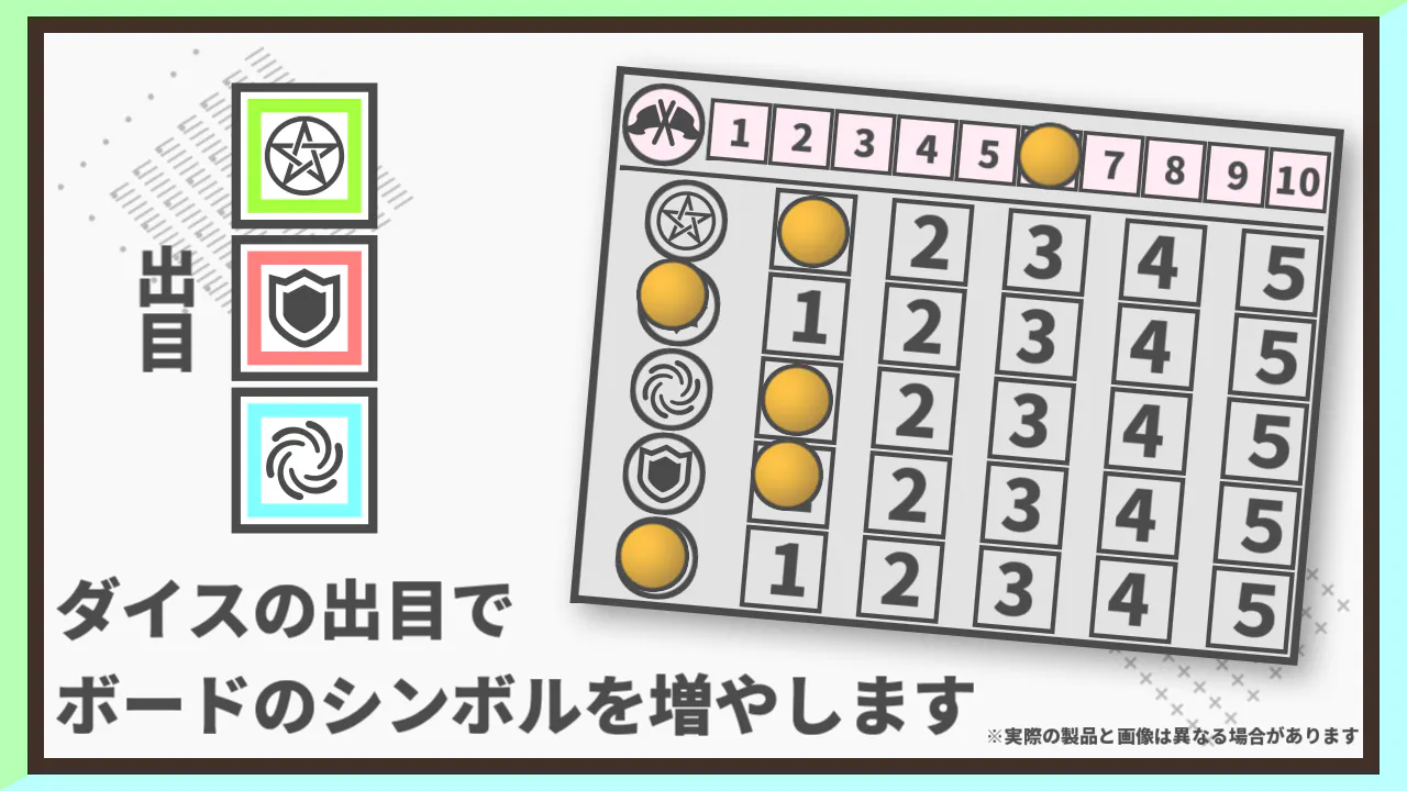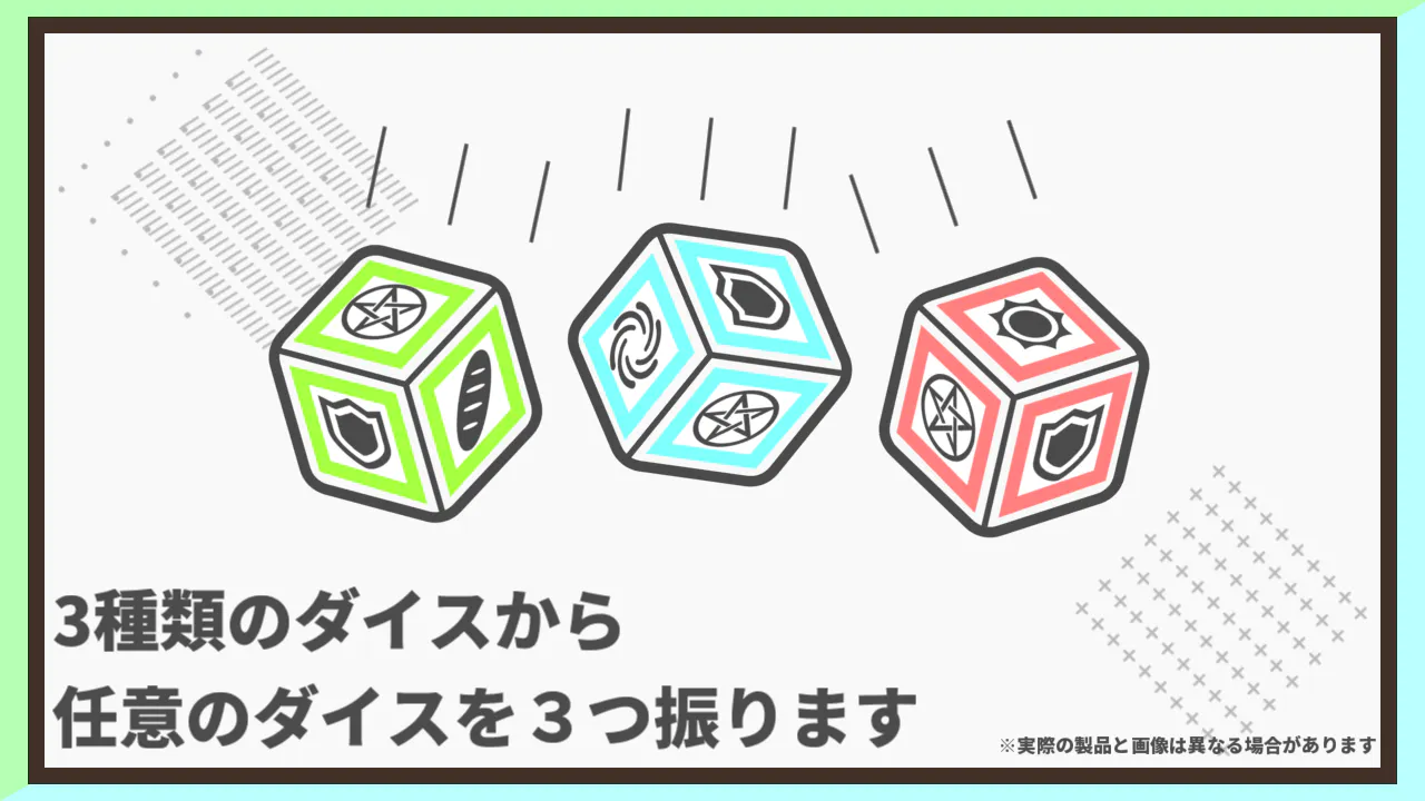 いっけんすると、遊〇王やデ〇〇〇マ○○ーズ、シ〇ド〇〇ースのようなカードゲームですが、毎ターンダイスを振ることができます。獲得したシンボルを臨機応変に使用し、勝利を目指します。