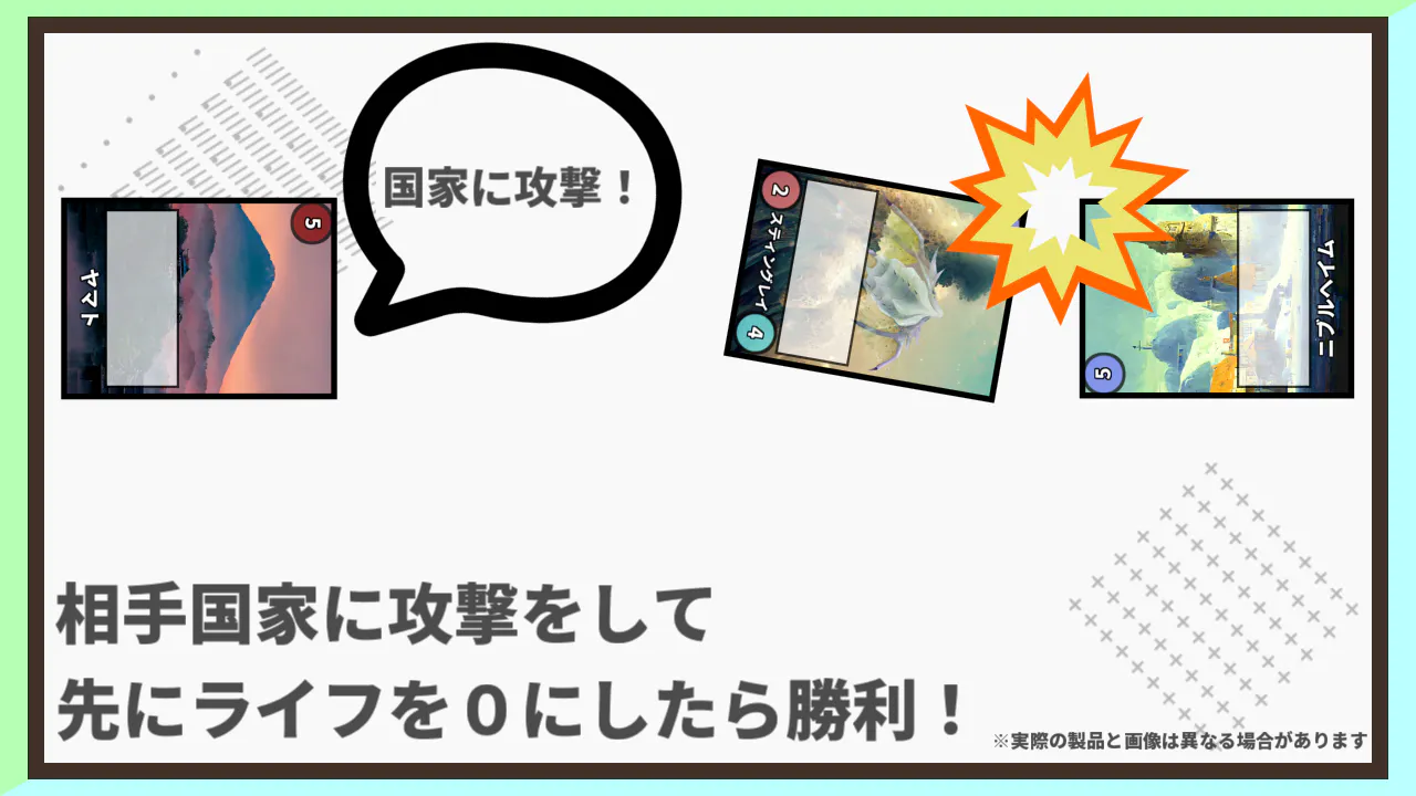 互いに国家の代表となり、相手の国家を先に滅ぼした方の勝ちとなります。