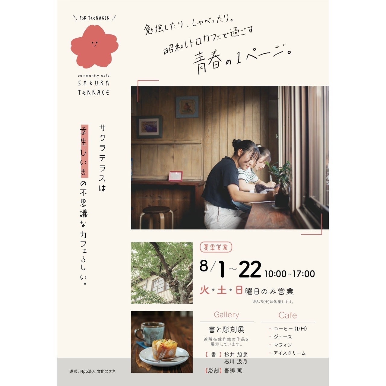 サクラテラス ワークショップday開催します!サクラテラスで外部から出店者をお招きしてやる自主イベントは初めて。今回ご出店いただくのは、*aroma soluagesさん*佐藤なな さん*社会福祉協議会 さんです。どちらかというと、大人の方向けのメニューとなっています。たくさんの方にご来場いただけると嬉しいです!社会福祉協議会さんのコーヒー体験は、申込みが必要です。ご希望の方はメール(bunkanotane.ohda@gmail.com)かインスタ等のDM、お電話でご連絡ください。皆様のご来場をお待ちしています。