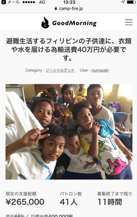 私は、3年前にフィリピンの先住民族 アエタ族と出会いました、彼らはフィリピンピナツボ山という大きな山が噴火したことから、それまで生活をしていた村を失い、避難生活をすることになりました、生活水は、二時間も歩いた先まで汲みに行き、自給自足の毎日を過ごしております、私は彼らに、衣類や文房具を渡すため、NHKや新聞で物資提供を呼びかけ、現在まで沢山の物資が私の会社に届いております。今まではバンボールに2個程度、毎月送り届け、私も現地に行き彼らに手渡しをしてきましたが、昨年フィリピンにIS過激派がテロをおこし、沢山の方が犠牲になり、親が殺され、家を破壊され避難生活をしていましたが、テロ組織を壊滅させることが出来た現在は、家や家族を失った子供達の一部は、帰る場所がない中、避難所を出されてしまいました。路頭に迷う子供達を救うために、今まで集めてきた大量の物資を送りたい。しかし大量の物資を送るには、50万円ほどの輸送費がかかってしまいます、マラウィという島に送り届ける輸送ルートは、北海道⇒名古屋⇒フィリピンマニラ⇒マラウィがある島 となります、陸地の輸送や船の輸送費用が多額にかかってしまうのです、皆様からの輸送費のご支援をお願い致します。