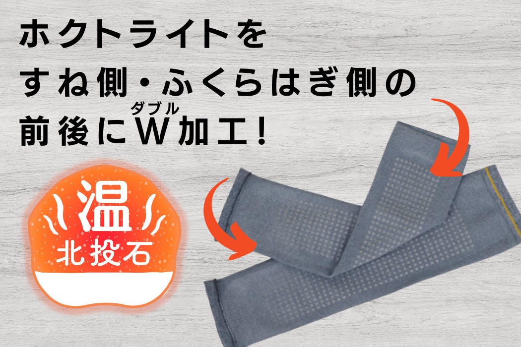 3シリーズすべて、ホクトライトの「健ま~る加工」を、すね側・ふくらはぎ側の両方に加工!ホクトライトを贅沢に使用したレッグウォーマーは遠赤外線パワーも2倍。保温力アップでさらにポカポカです!