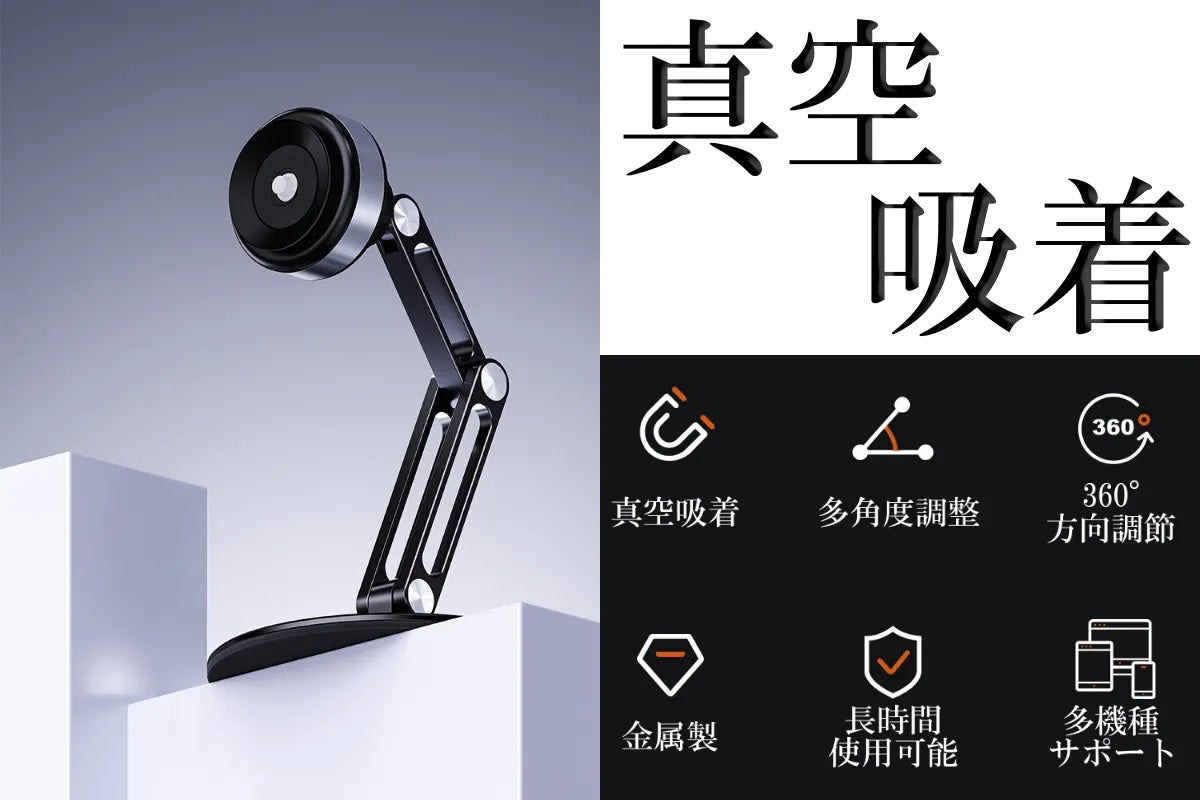 真空の力でタブレットPCやスマホをスタンドにピタッと吸着。