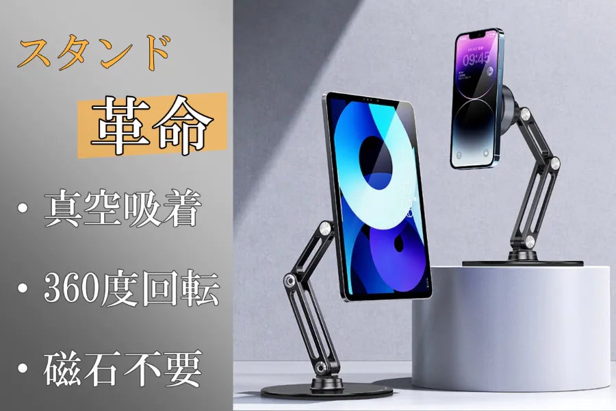 スタンド革命!真空で吸着するタブレットスタンド。360°回転も可能で使い勝手抜群