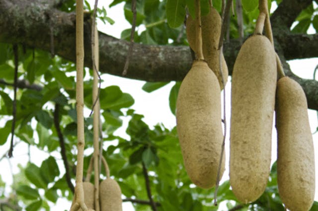 アフリカ全土に分布する大木で、最大で長さ 60cm、重さ 7kg の灰色がかったソーセージ型の果実を実らせます。