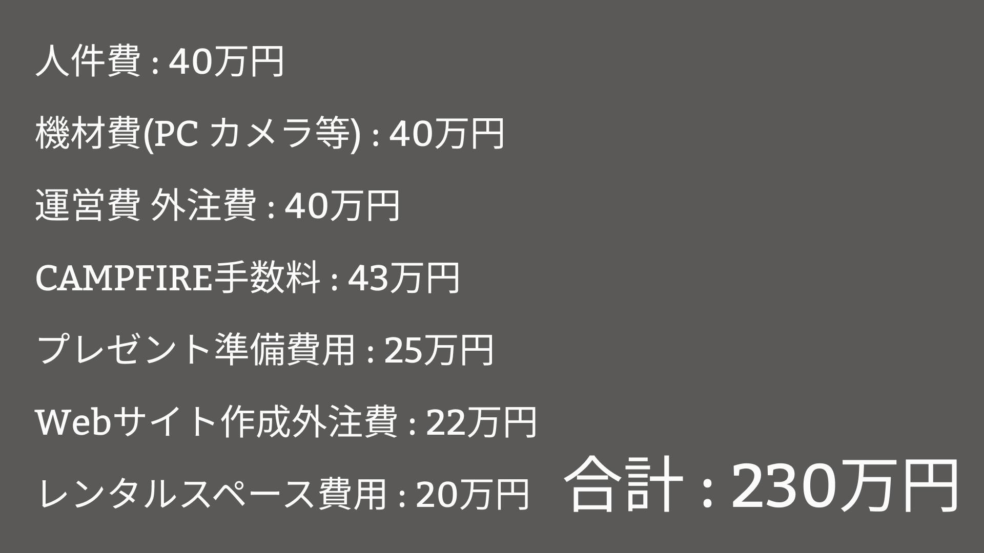 頂いた支援金に関しては以下の通りで使用させて頂きます。