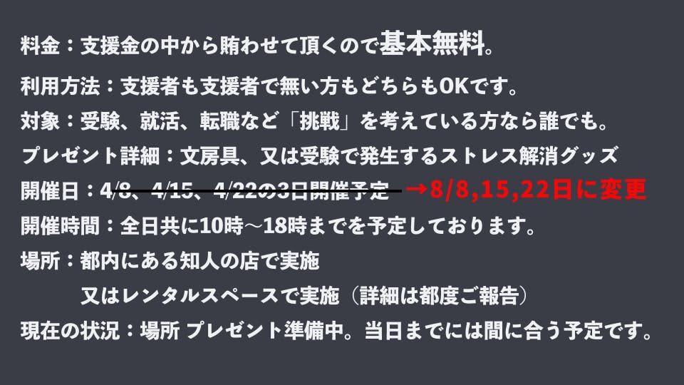 自己紹介の欄でもお話しさせて頂きましたが 受験生、就活生、転職を考えている方の支援を実施致します。