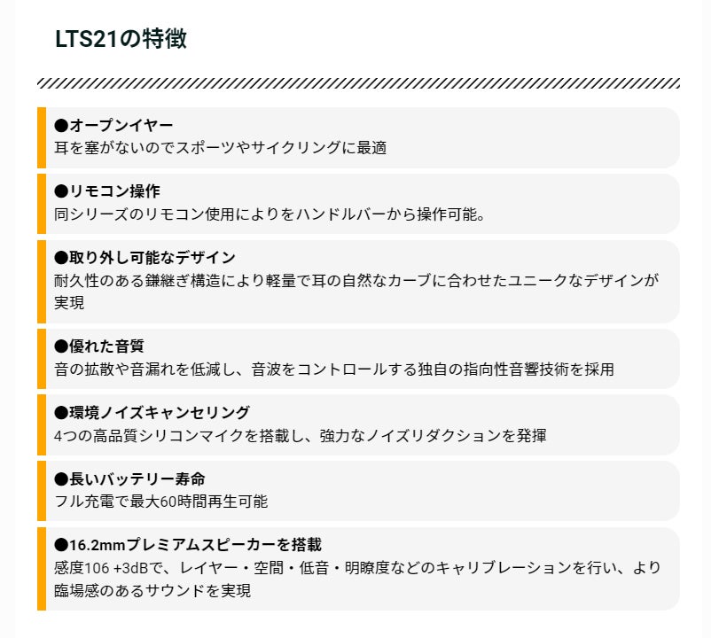 また、耳の自然なカーブに合わせたユニークなデザインは、LTS21がヘッドマウント型オープンイヤーTWSヘッドホンの中で最も軽量と呼ぶにふさわしいものです。