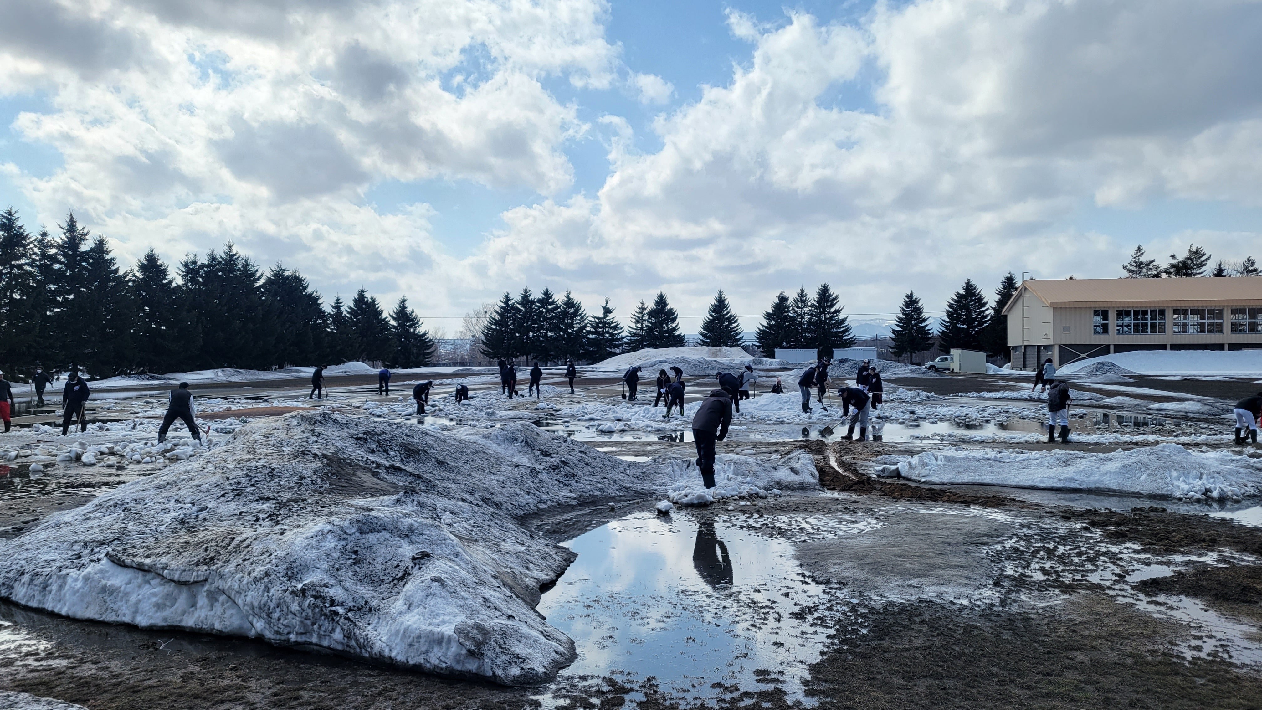 3~4月は、グラウンド内の雪や氷を割ったり外に運び出したりする通称「雪割り」から始まります。グラウンドでノックやバッティングなど自由に野球が出来るようになるのは4月中旬です。