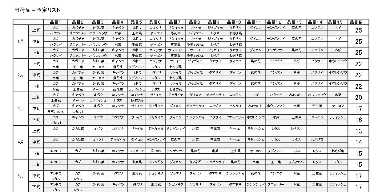 ※内容:野菜(約80品目以上)の栽培管理、土壌、施肥、農業機器の使用方法、収穫・調整、作付け、スケジュール管理運用