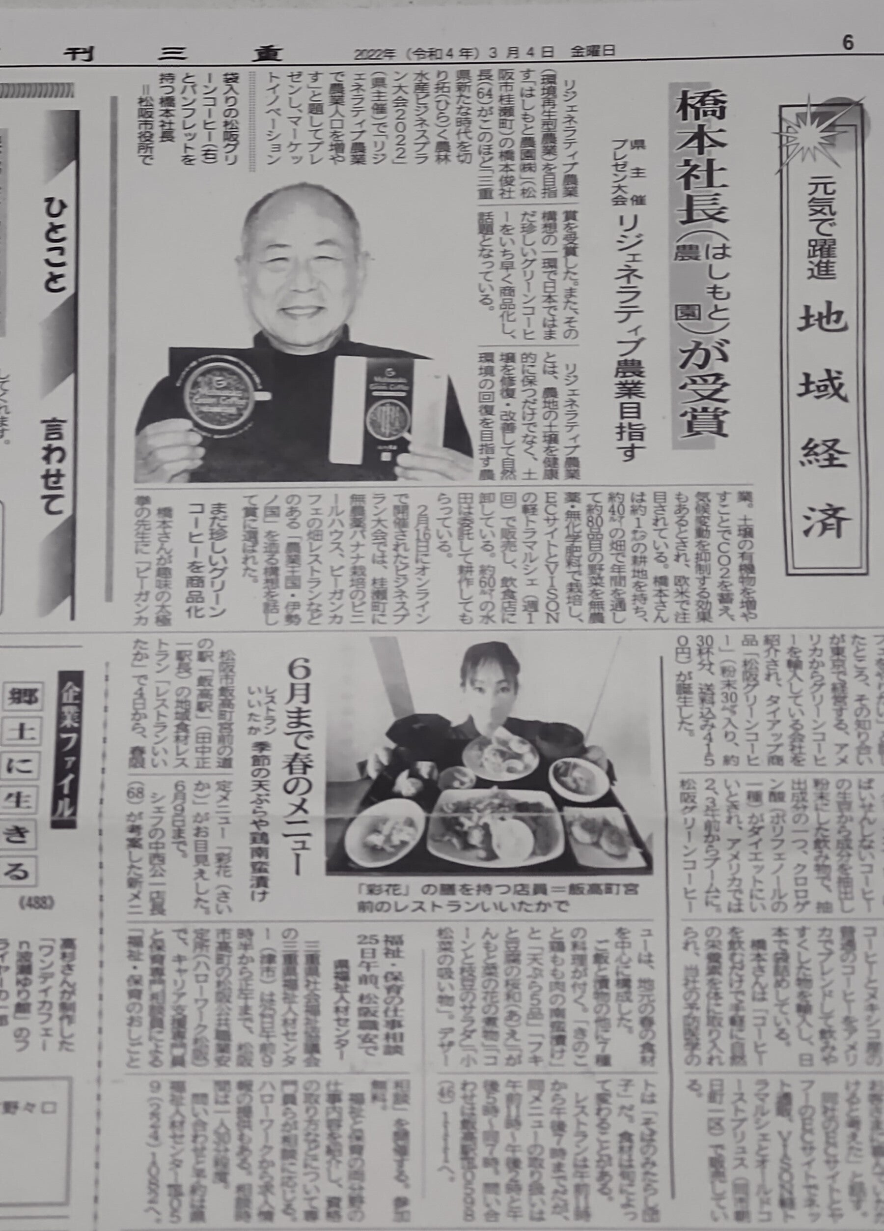 地域経済のページで、県主催プレゼン大会「リジェネラティブ農業目指す」というタイトルにて はしもと農園がマーケットイノベーション賞を受賞したと記事にしていただきました。