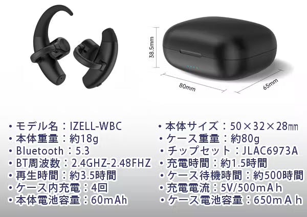IZELL-WBC01は大容量の充電式専用ケース付きで650mAHの容量を搭載しています。