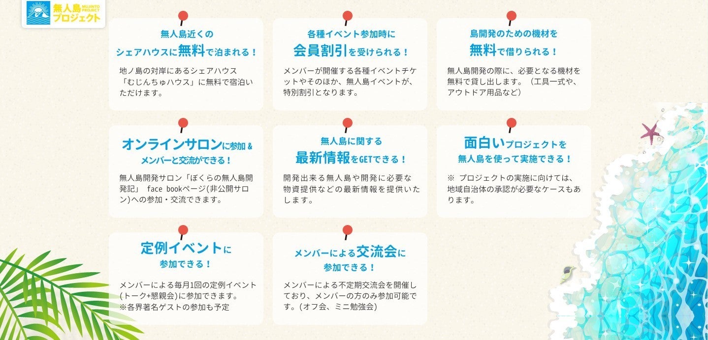 無人島開発サロンの具体的な特典はHPもご確認くださいね! http://kaihatsu.mujinto.jp/