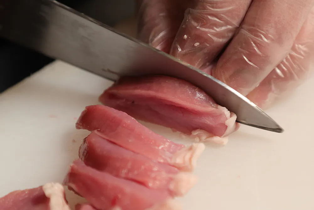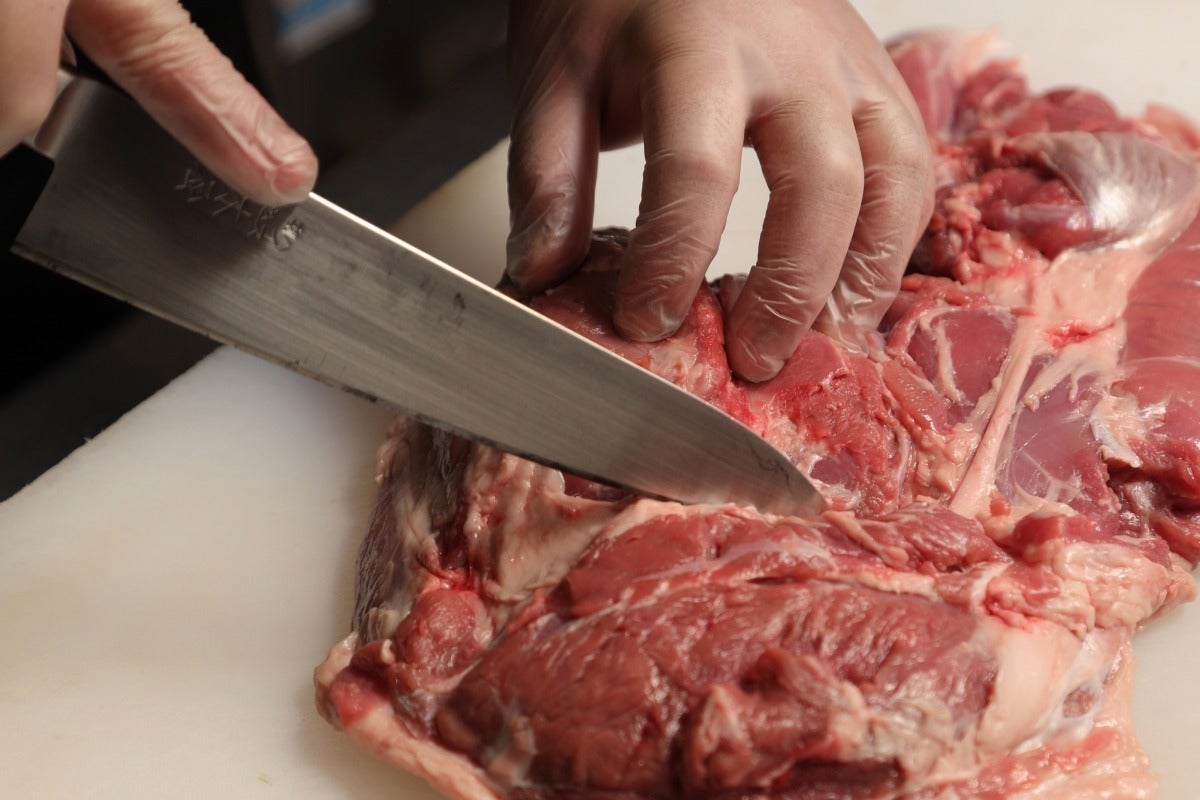 筋の切り方、脂の残し方で、口当たりや風味が変わってしまう貴重なラム肉を、最も良い状態で楽しんで頂くために細心の注意を払い、一切れ一切れ手作業で切り分けます。
