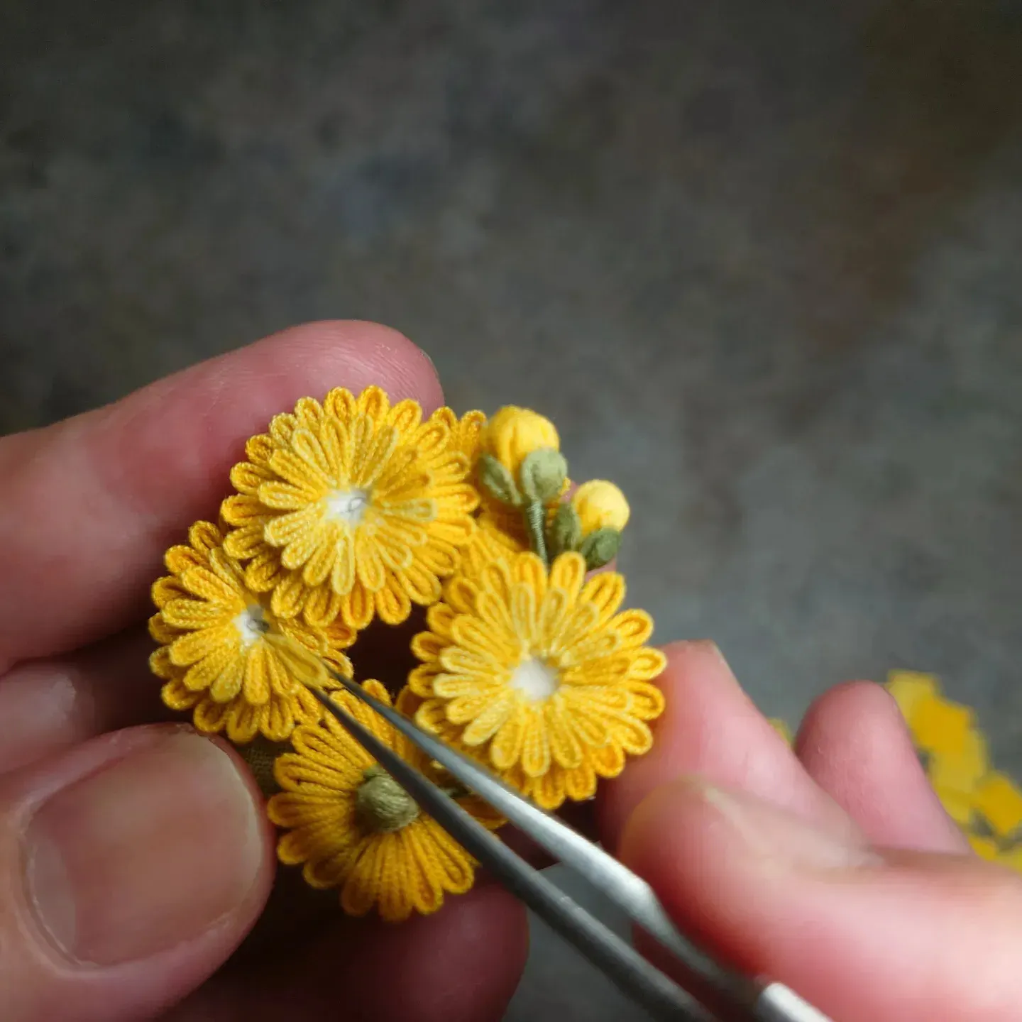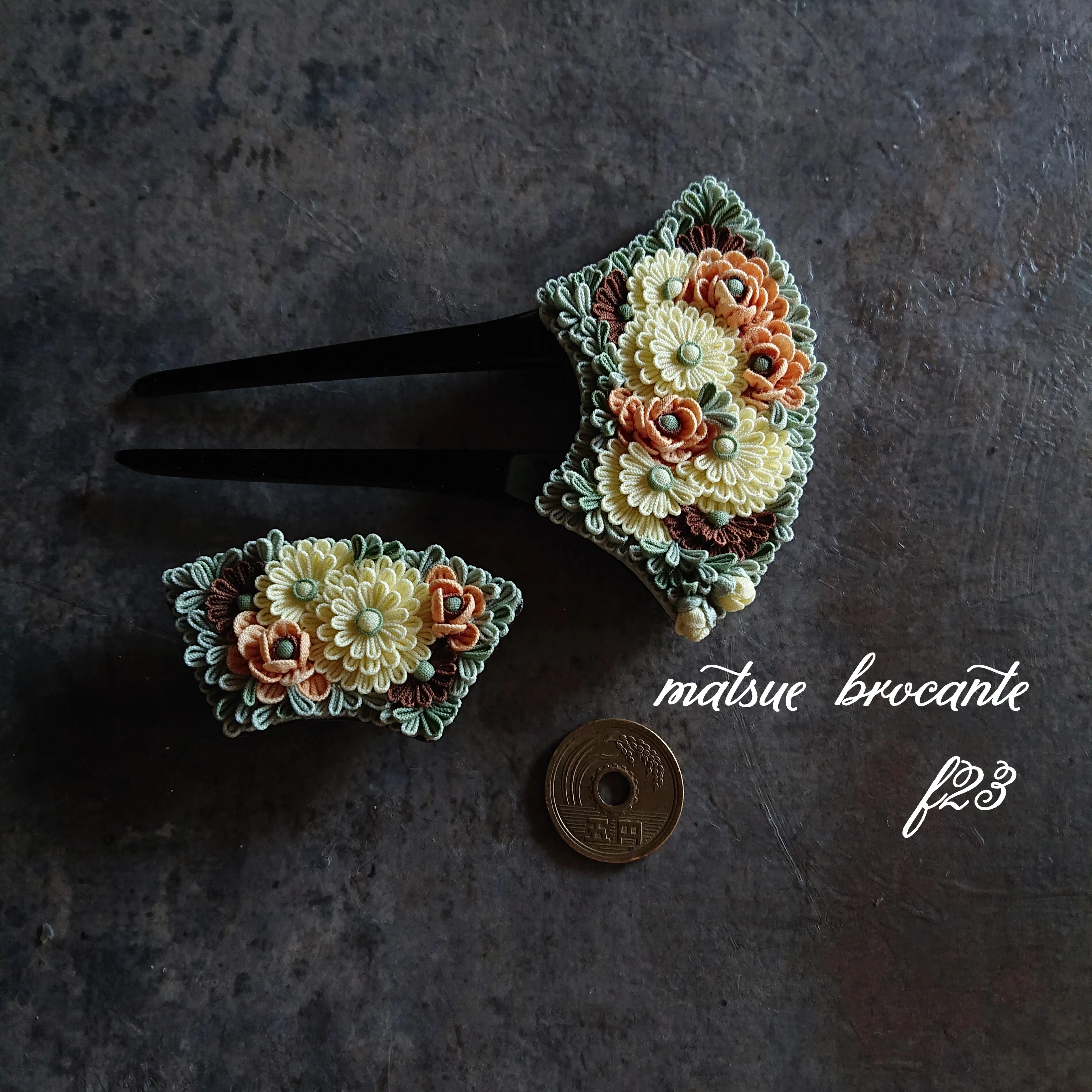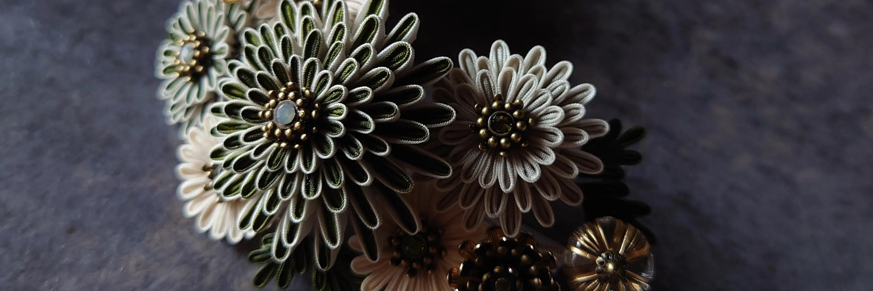 初めまして。つまみ細工の髪飾りや装飾品の作成、販売を生業としています、matsue brocante (マツエブロカント) つまみ細工のお店 f23(エフ ニジュウサン)の店主、前田二三代と申します。