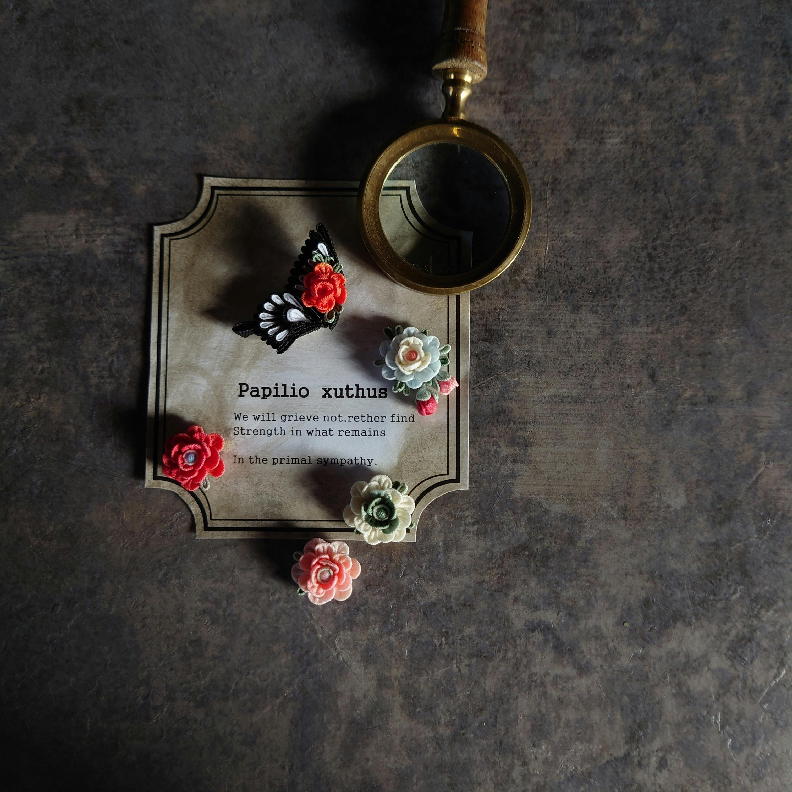 作成に取り組んだのは髪飾りの年数がそれなりですが、小さなつまみもそこそこ作って参りました。先日のつばめのブローチも何度目かの改良。今回の蝶々の耳飾りは温めていたものの、ちょっと初めての試みでドキドキです