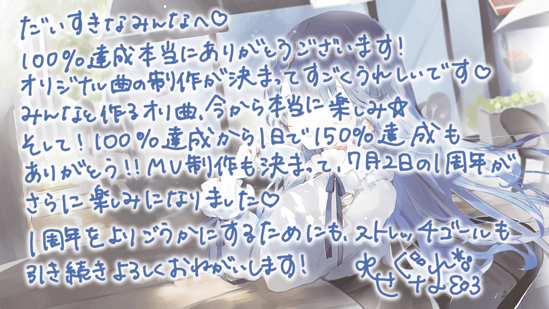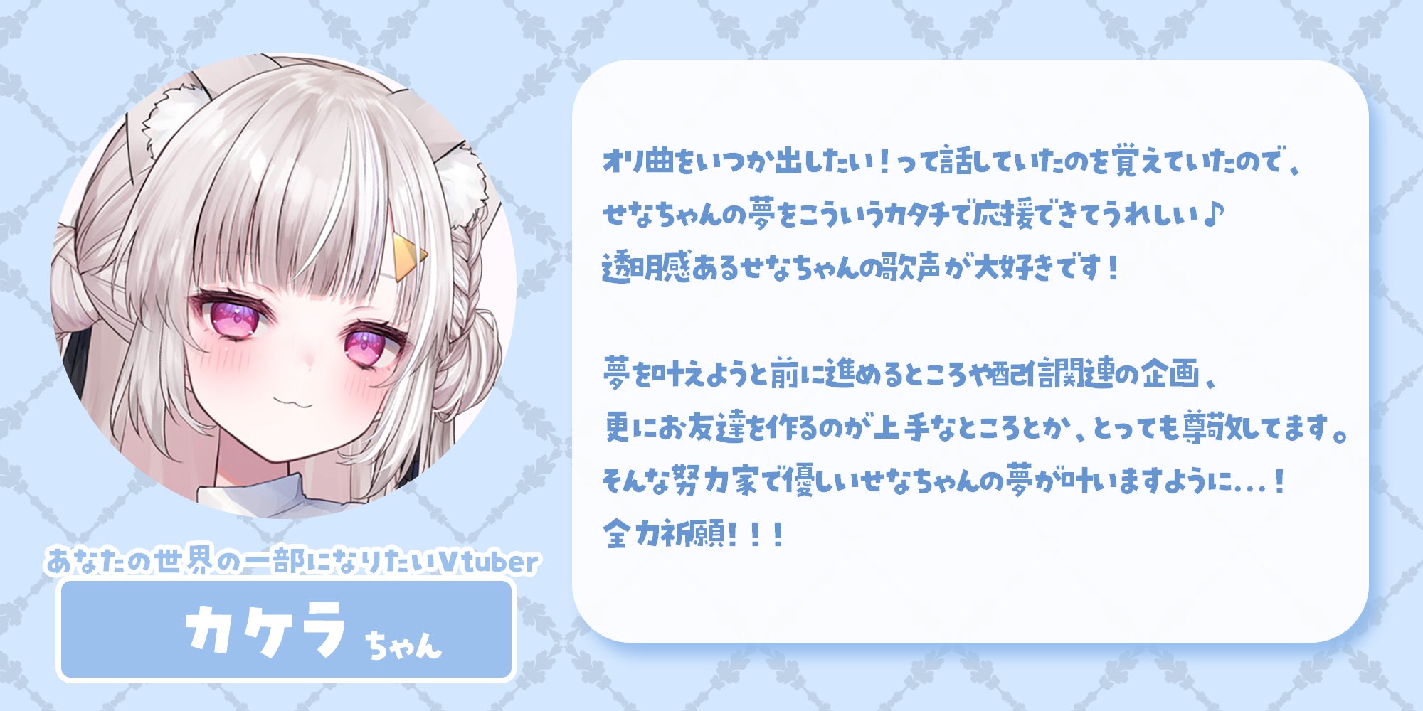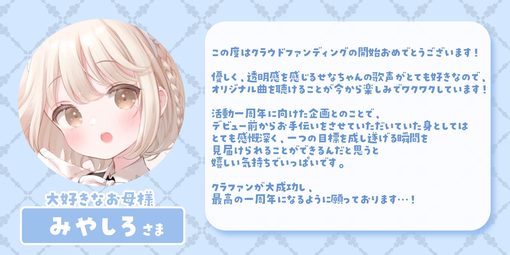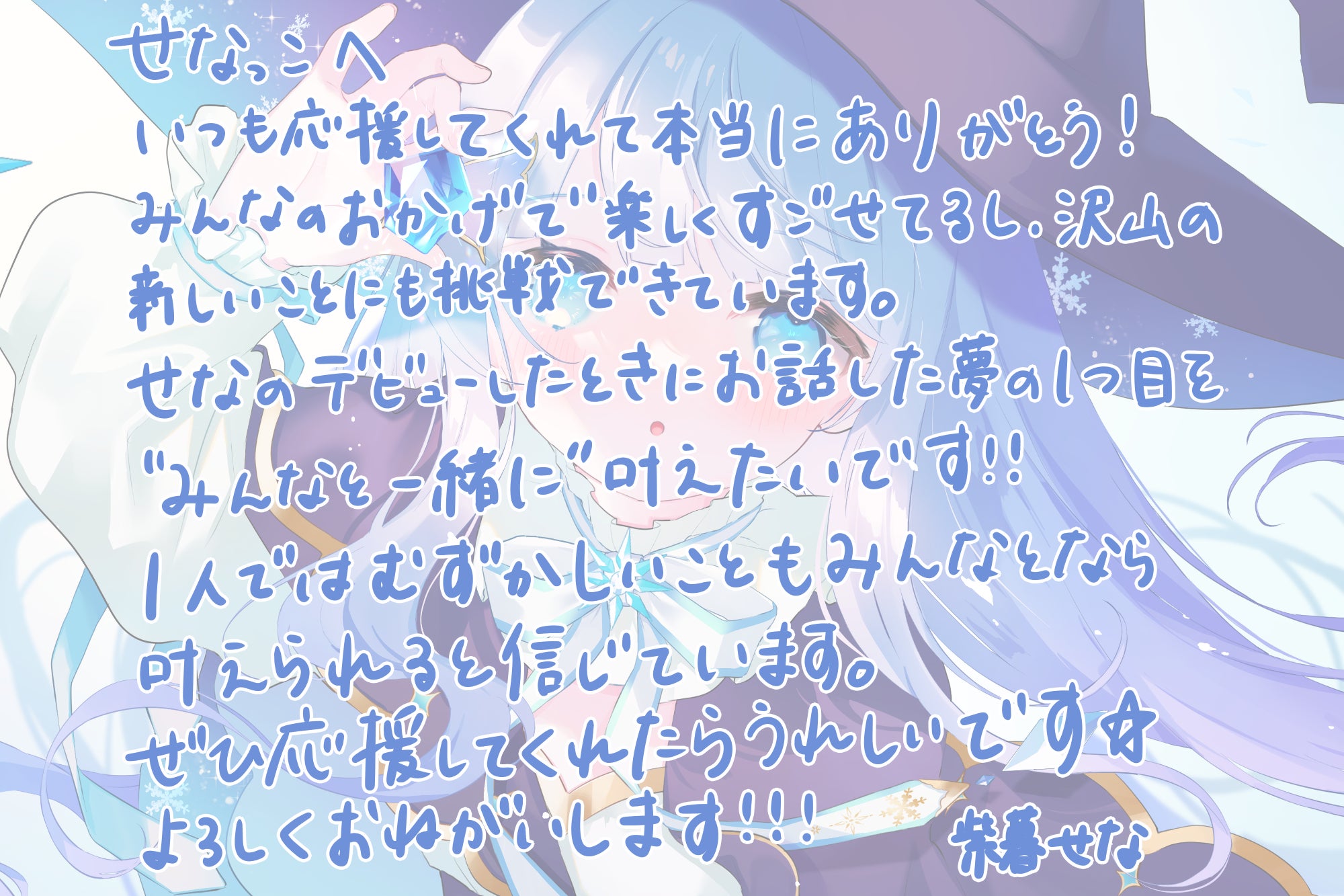 1周年では、日頃の感謝を込めて新衣装の発表を予定していますが、せなが既に用意しているものの他に「みんなと一緒に夢を叶える」という最高の思い出も作りたいと考えています。