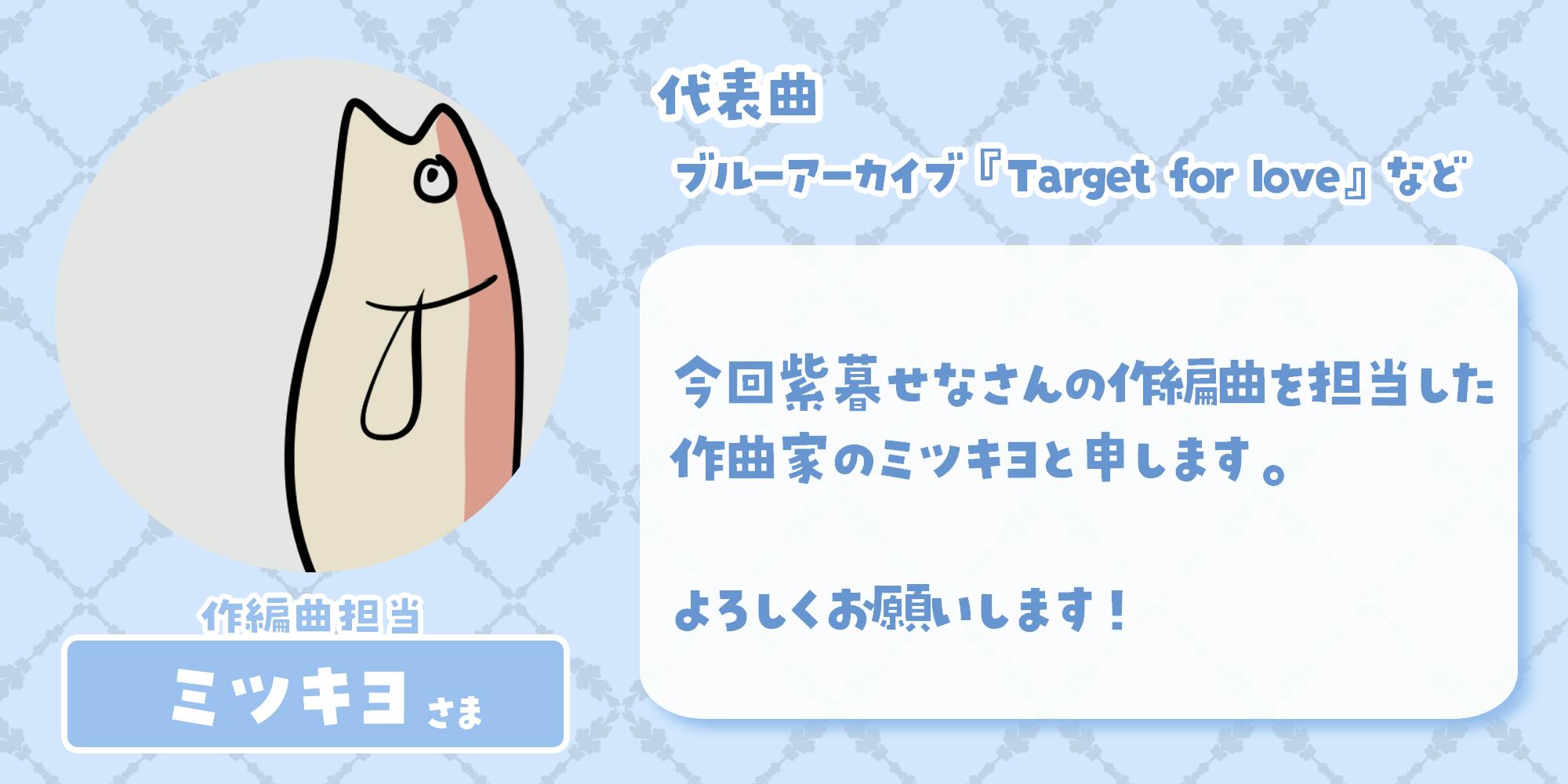 ゲーム「ブルーアーカイブ」のBGMや様々な方のオリジナル曲などを制作されているミツキヨさんが作曲・編曲を担当してくださいます!キラキラとしたとても素敵な曲を書かれる方なので今からどんな曲になるかとても楽しみです!