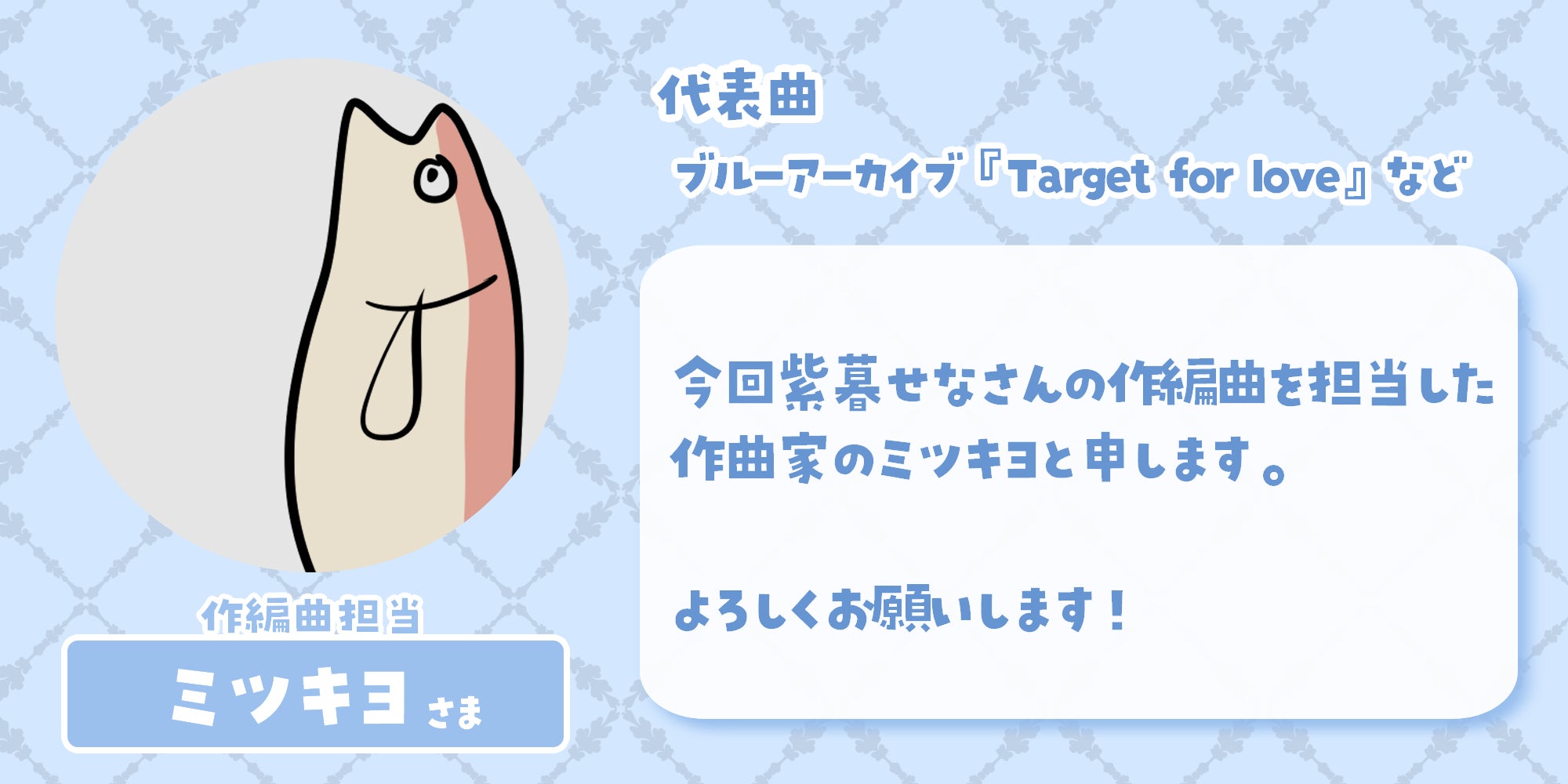 ゲーム「ブルーアーカイブ」のBGMや様々な方のオリジナル曲などを制作されているミツキヨさんが作曲・編曲を担当してくださいます!キラキラとしたとても素敵な曲を書かれる方なので今からどんな曲になるかとても楽しみです!