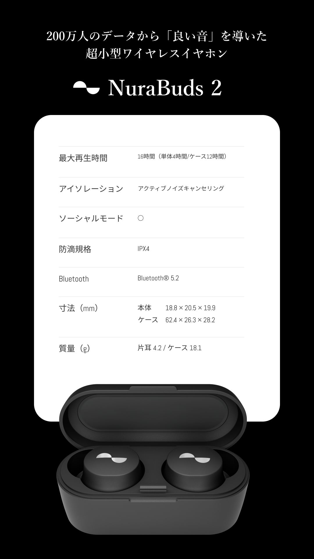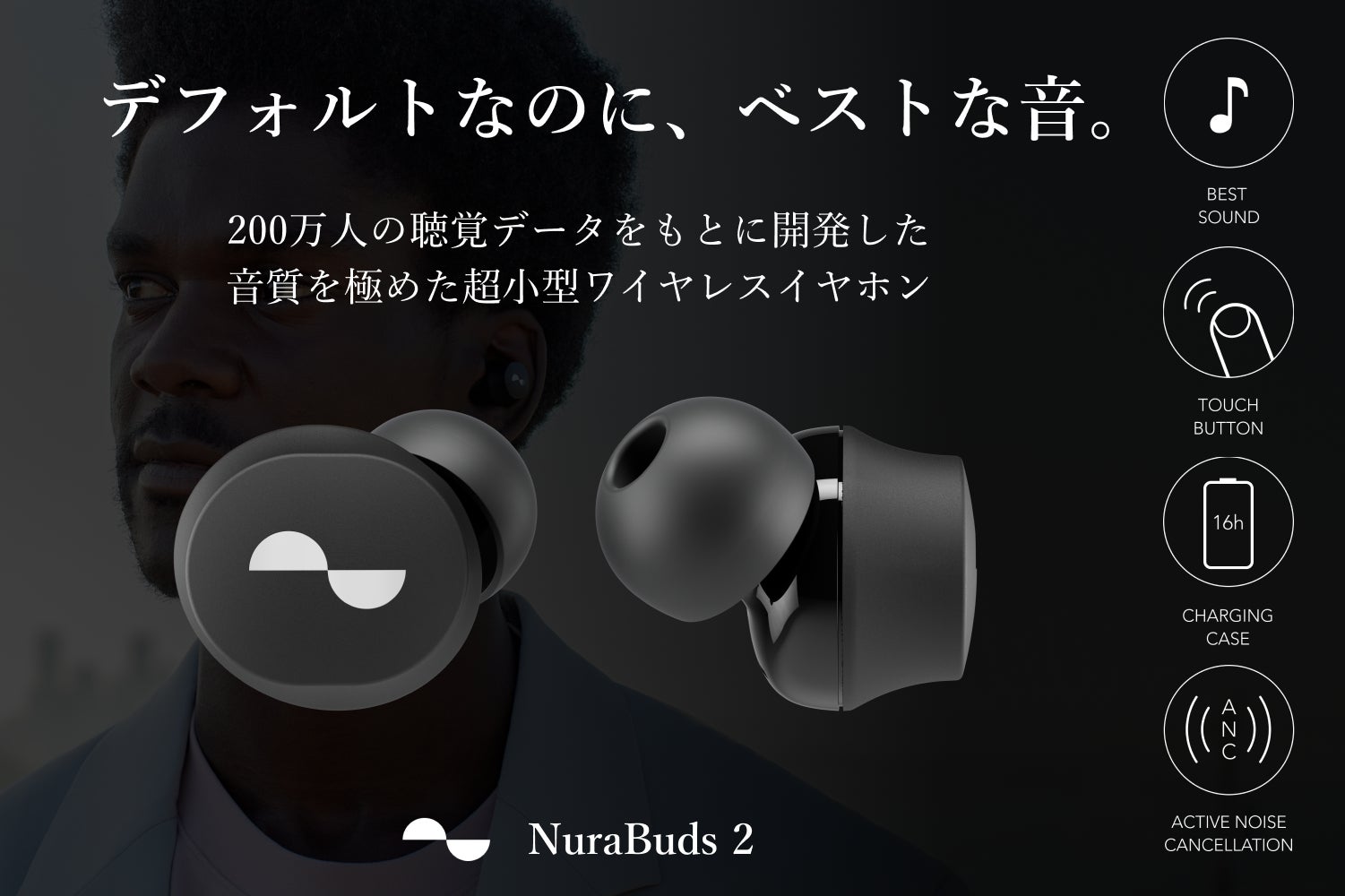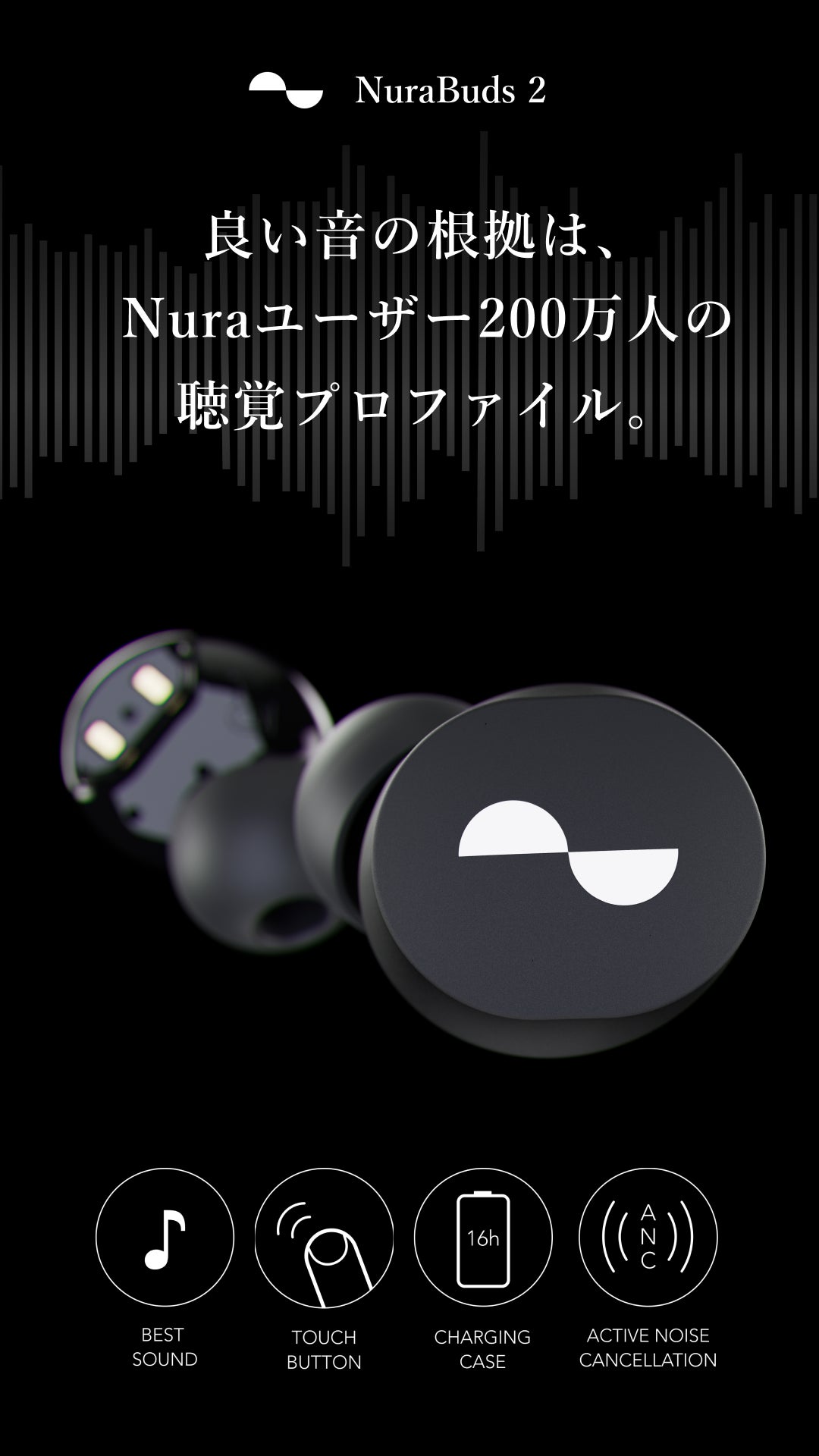 NuraBudsのデフォルトの音質は、200万人以上Nuraユーザーの聴覚測定データベースから導き出されたもの。パーソナライズに注力してきたNuraだからこそできる、誰にとっても良い音を低価格で実現したのがNuraBuds2です。