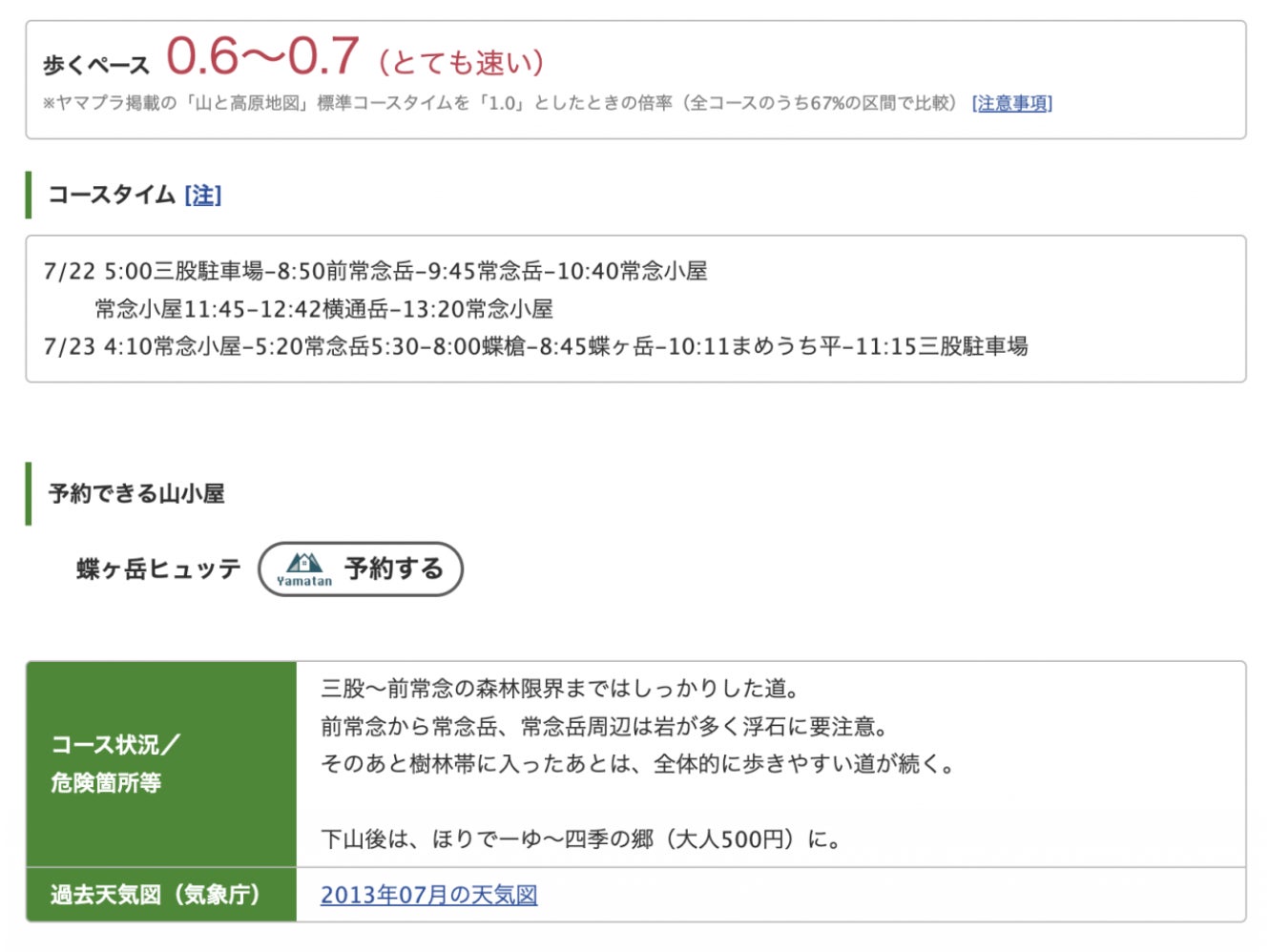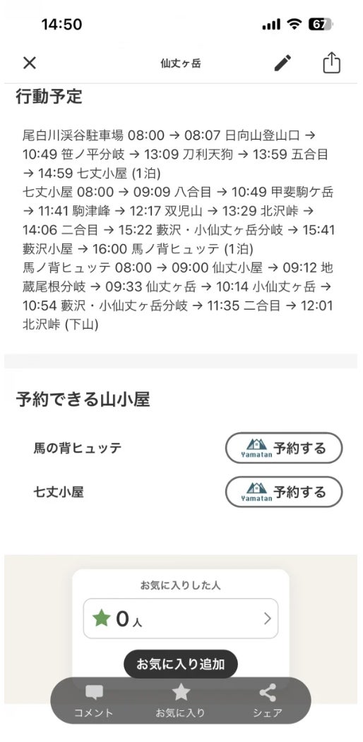 やまたんで予約できる山小屋を通る山行記録や山行計画の場合、「予約できる山小屋」の欄に「予約する」ボタンが表示されます。