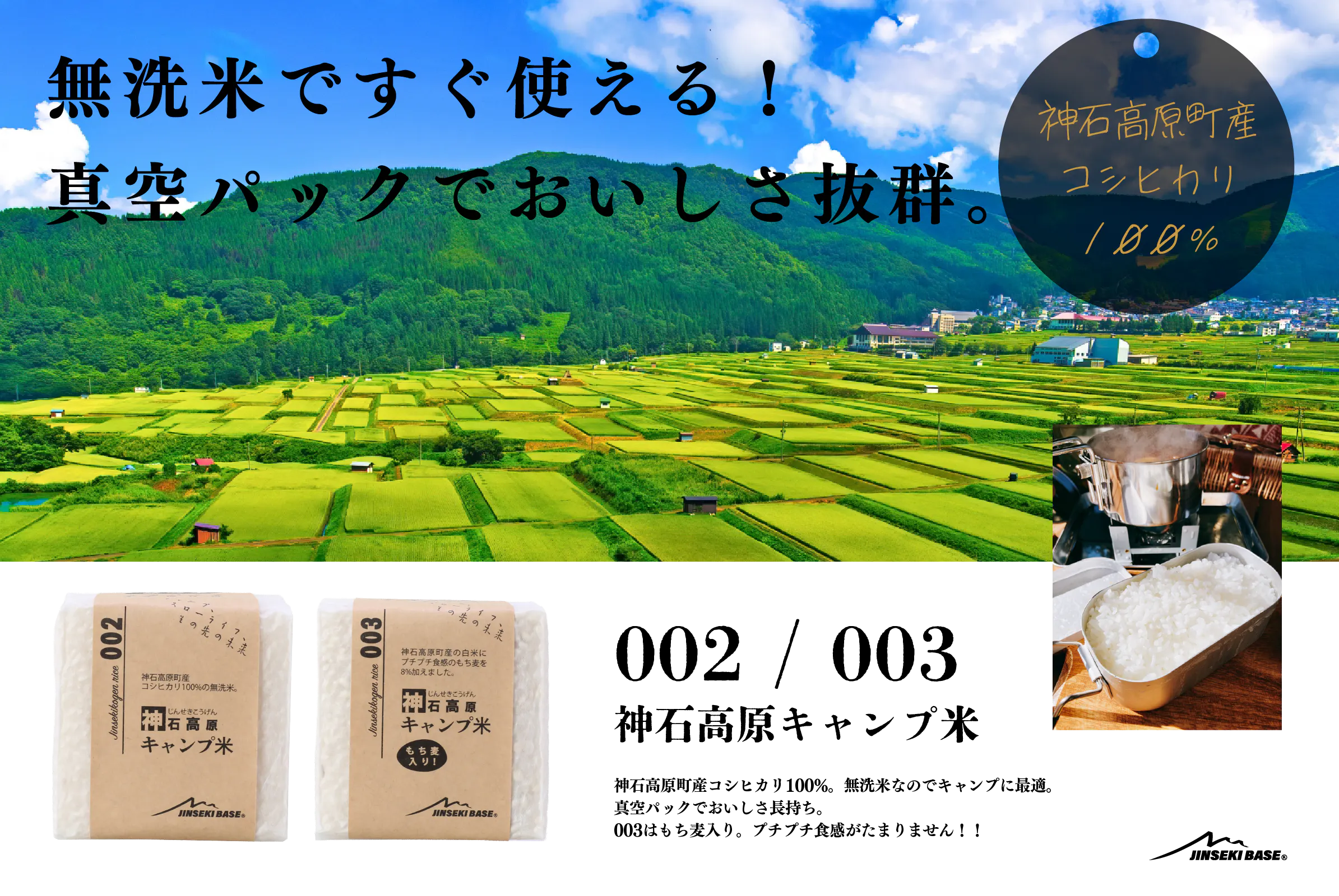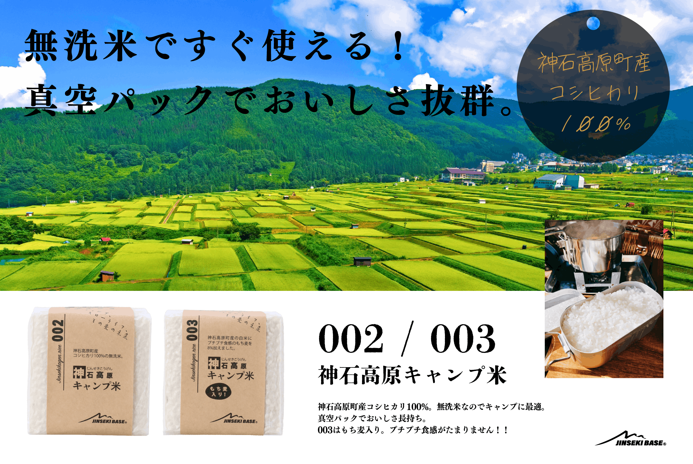 ◉002 / 003 神石高原キャンプ米(神石高原町産コシヒカリ、2合・無洗米・真空パック)
