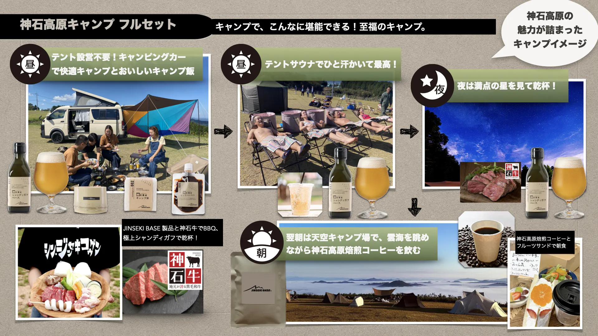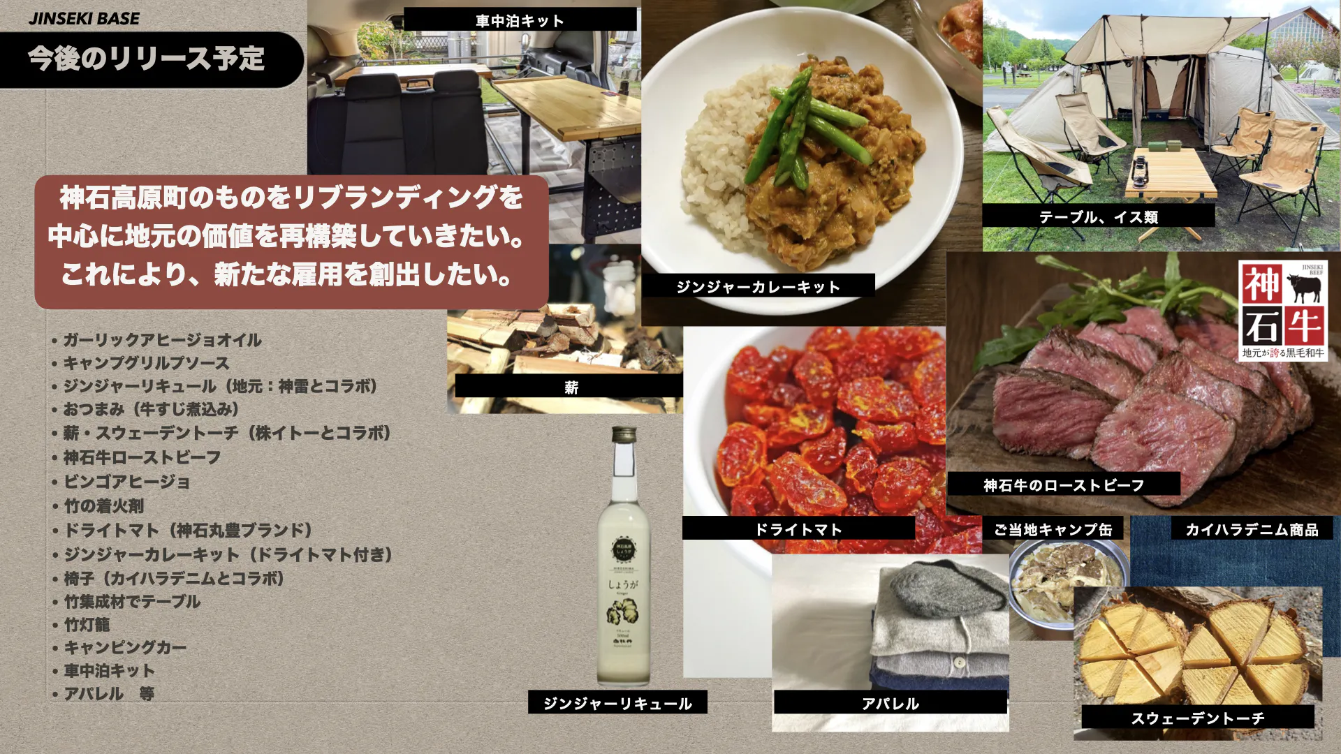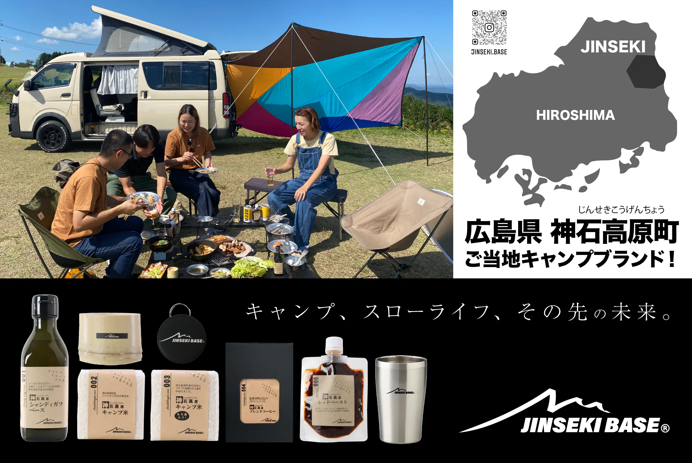キャンプに使えるツールはもちろん、食材も神石高原町の逸品・良品をキャンプ用にアレンジした製品をお届けします。今後リリース予定の企画も盛りだくさんです。