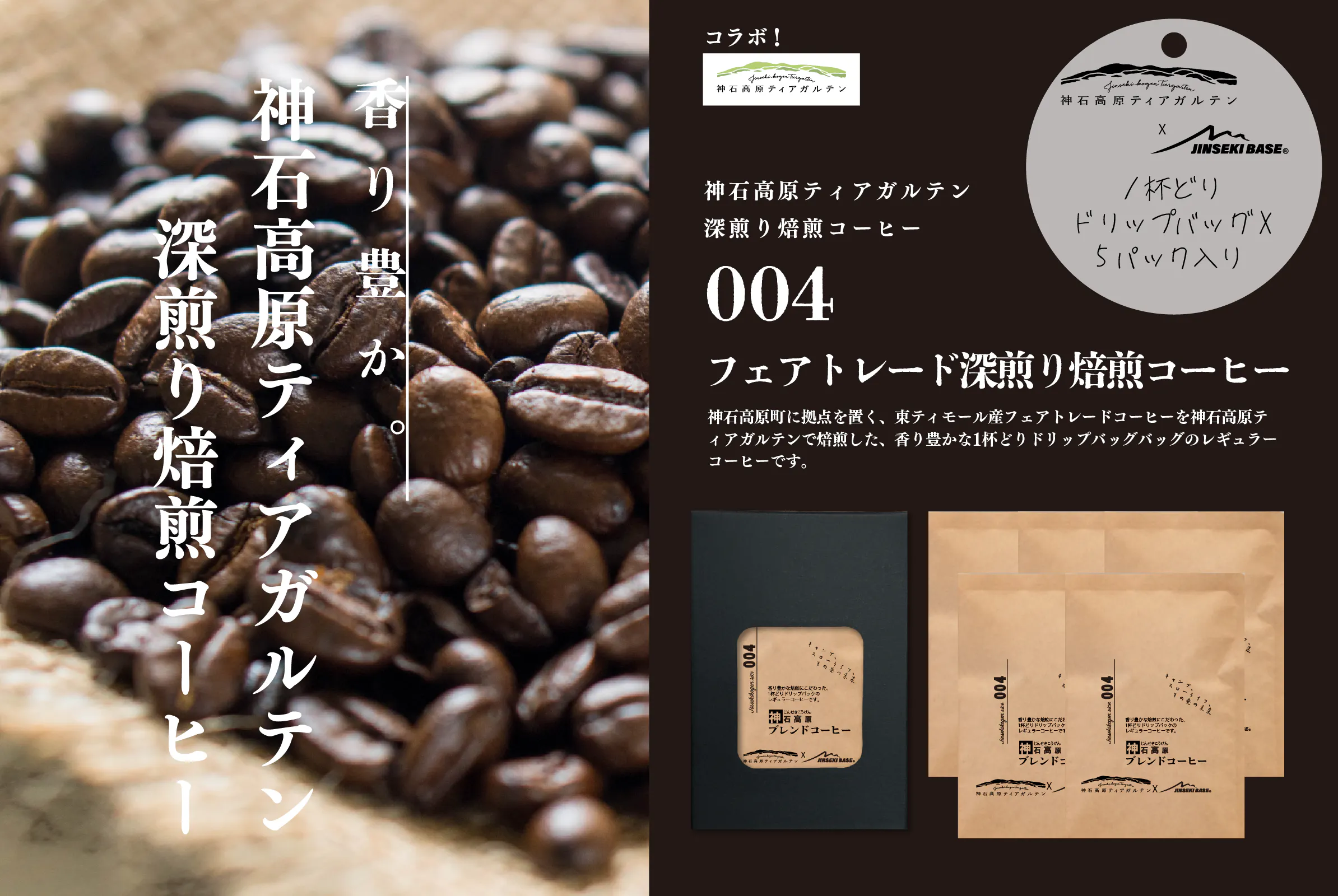 神石高原町に拠点を置く、ピースウィンズジャパンのフェアトレードコーヒー(東ティモール産)を使って、『神石高原ティアガルテン』で自家焙煎したコーヒーを1杯取りのドリップバッグにしました。