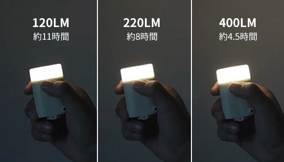 ランタンの輝度が120ルーメン/220ルーメン/400ルーメンと3段階調整が可能。