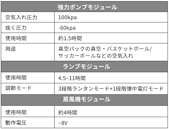 A:一度に接続できるモジュールは1つだけなので、強力ポンプモジュール、ランプモジュール、扇風機モジュールの機能を同時に使用することはできません。モジュール機能と本体の機能(空気入れ/抜き・ストロボライト)は同時に使用できます。