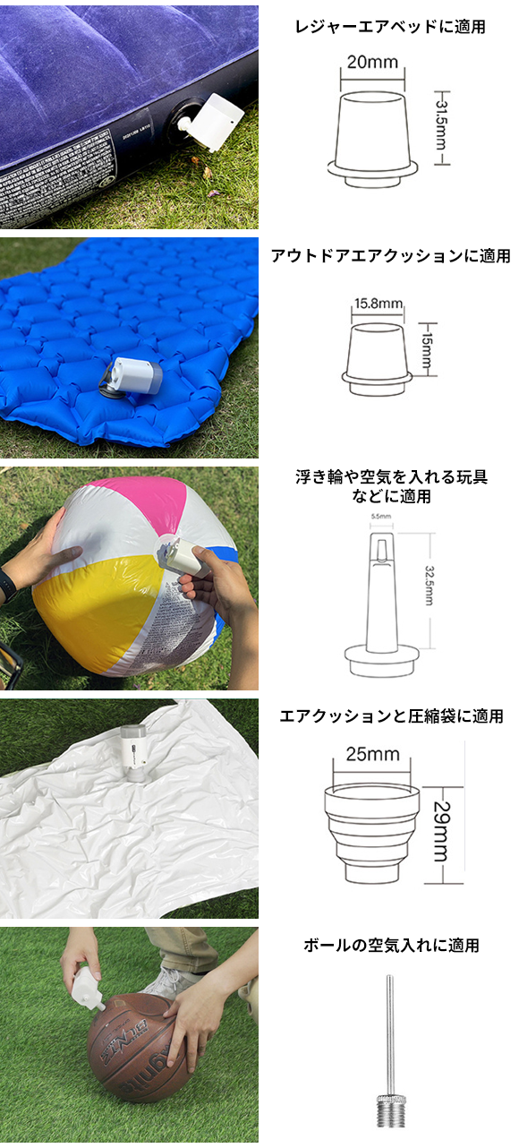 様々な用途に応じて4種類のノズルをご用意。エアマットレス、エアピロー、子供用おもちゃ、ヨガボールなど、各種アウトドア用品に対応。