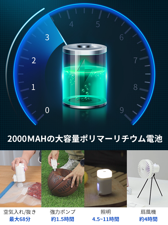 ・1台8役!空気入れ・空気抜き・送風・ランタン・懐中電灯・扇風機・食品真空・ストロボライトが1つに!