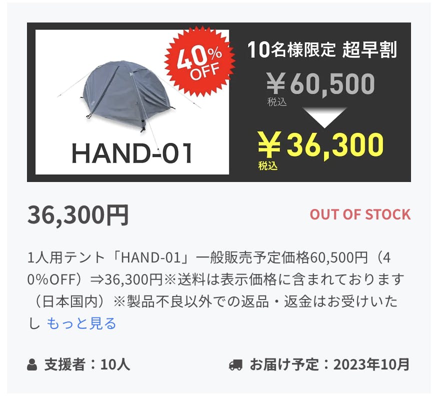 2023/09/24 14:32沢山のご支援ありがとうございます!超早割40%OFFのHAND-01がおかげさまで完売致しました。予想よりも早い完売に、ソロキャンプの需要を感じております。ご支援いただいたキャンプ好きの皆様、関係者一同心より感謝申し上げます。引き続き、早割で30%OFFが20名様限定でご用意しておりますので。ご興味ある方は是非ご覧になってみてください。 もっと見る