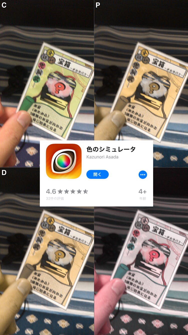 アプリを通して見ると、黄色や緑が見えにくい感じでしょうか。