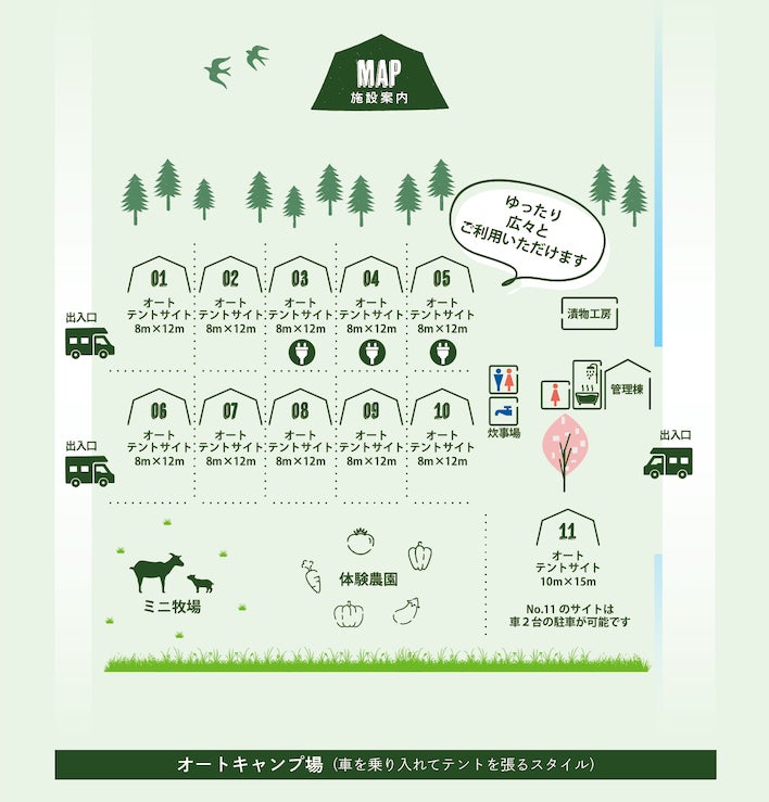 また、広大な敷地でのテントサイトは車の乗り入れが可能です。8m×12mのオートテントサイトは車2台で乗り入れも可能な広々設営ができて、家族や仲間とゆっくりお楽しみいただけるスペースを確保しました。