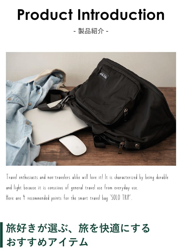 普段使いから一般の旅行使いを意識した、丈夫で軽い、ミニマムですっきりしたデザインのパッカブルトート「SOLO TRIP」。