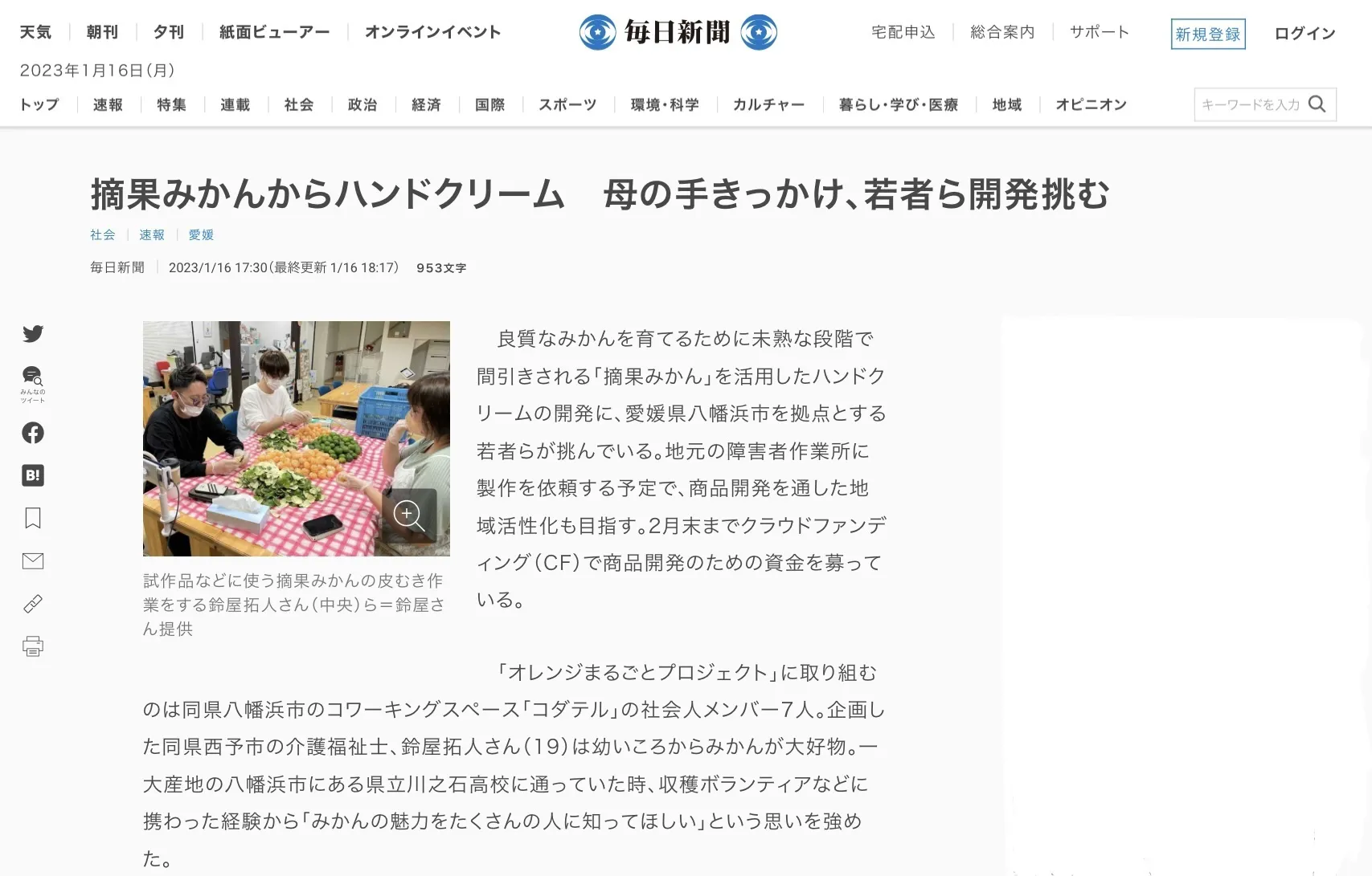 本日、毎日新聞さんにオレンジまるごとプロジェクトについて掲載して頂きました。
