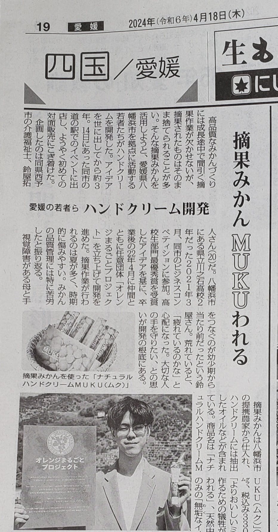 4月18日付けの毎日新聞朝刊四国面で掲載して頂きました!