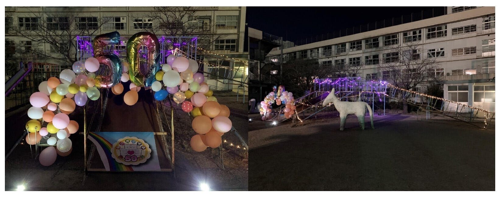 多くの子どもたちや卒業生がライトアップされた遊具を後ろに撮影していました。