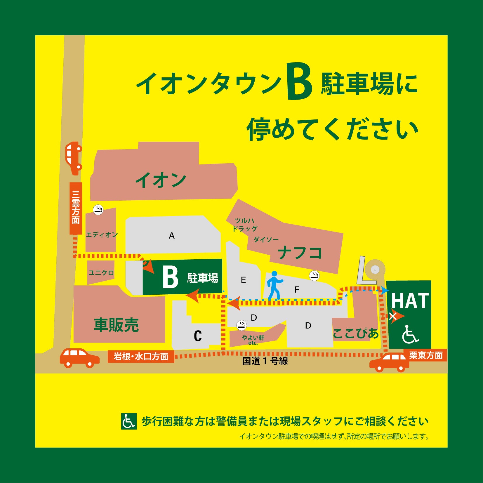 なおイオンタウン駐車場内の喫煙はしないで、所定の位置でお願いします。