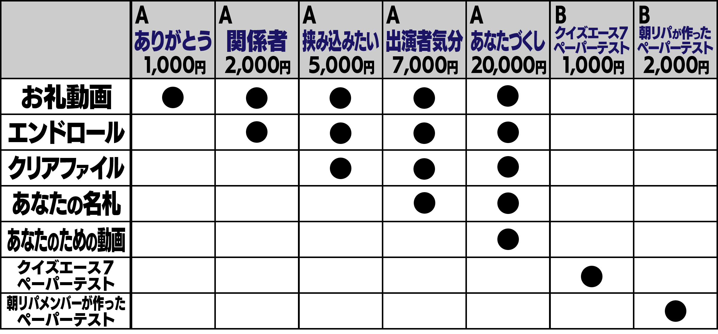 第7回クイズエースの最終回にて流れるエンドロールの「クラウドファンディング支援」欄にお名前を記載させていただきます。必ずエンドロールに記載するお名前を10文字以内(ひらがな・カタカナ・漢字・アルファベット・数字は問わない)で明記してください。お名前が公序良俗に反する場合は変更を求める場合があります。