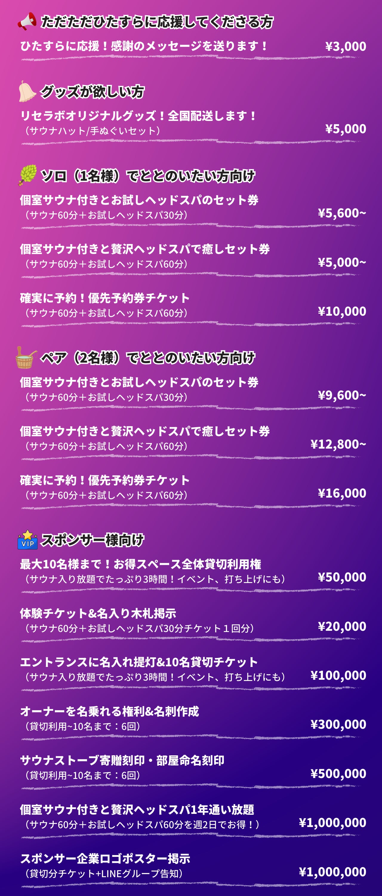 1名様、2名様の体験利用を前提とし(追加で3名様での対応も可)、90分の「体験コース」と120分の「贅沢コース」の2種類を用意。リセラボをいの一番に体験できるよう「優先予約チケット」もご用意しております。