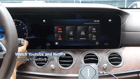 本体をカーナビやモニターに接続すると、YouTubeとNetflixの動画を視聴することができます。また、お好きな音楽や映画を保存したUSBメモリーを本体に差し込めば、USBメモリーに保存した音楽や映画も視聴できます。その他にもワイヤレスApple CarPlayとAndroid Autoの両方対応……