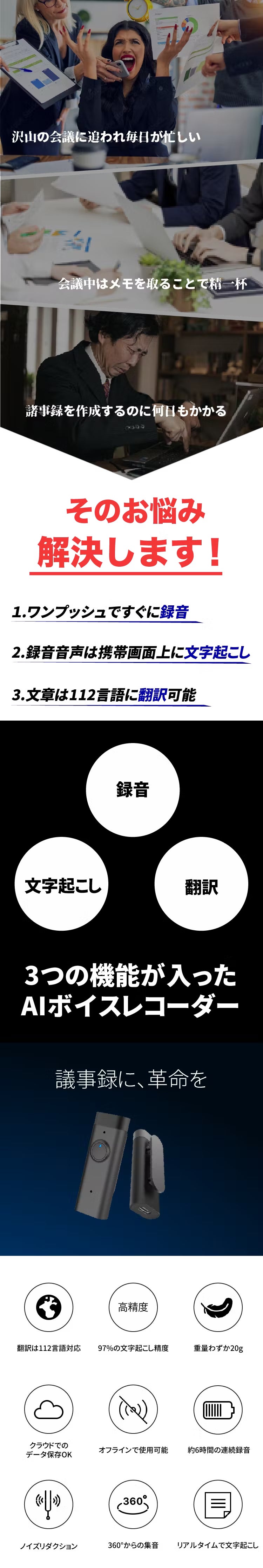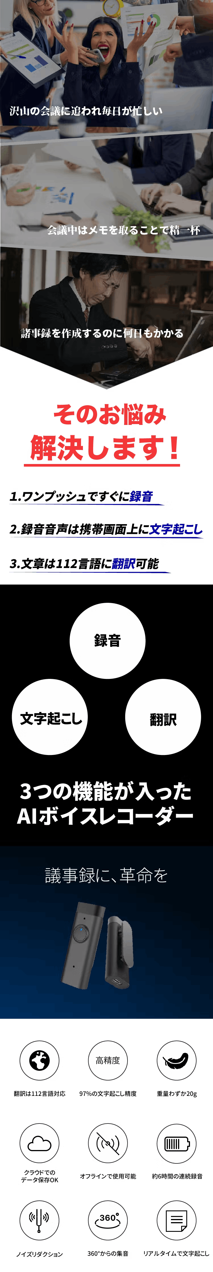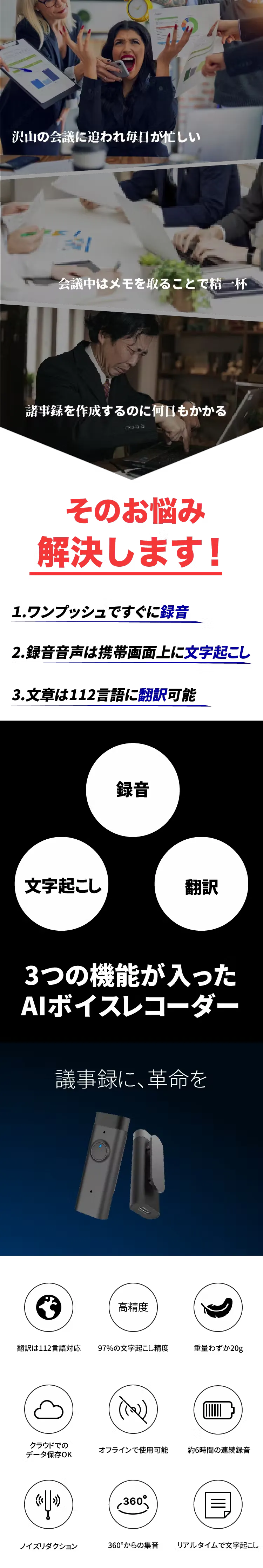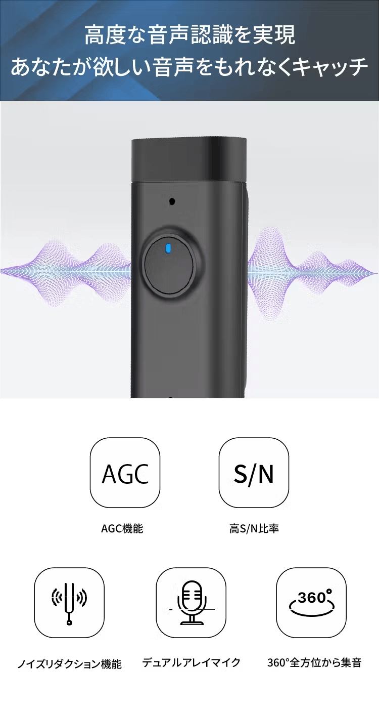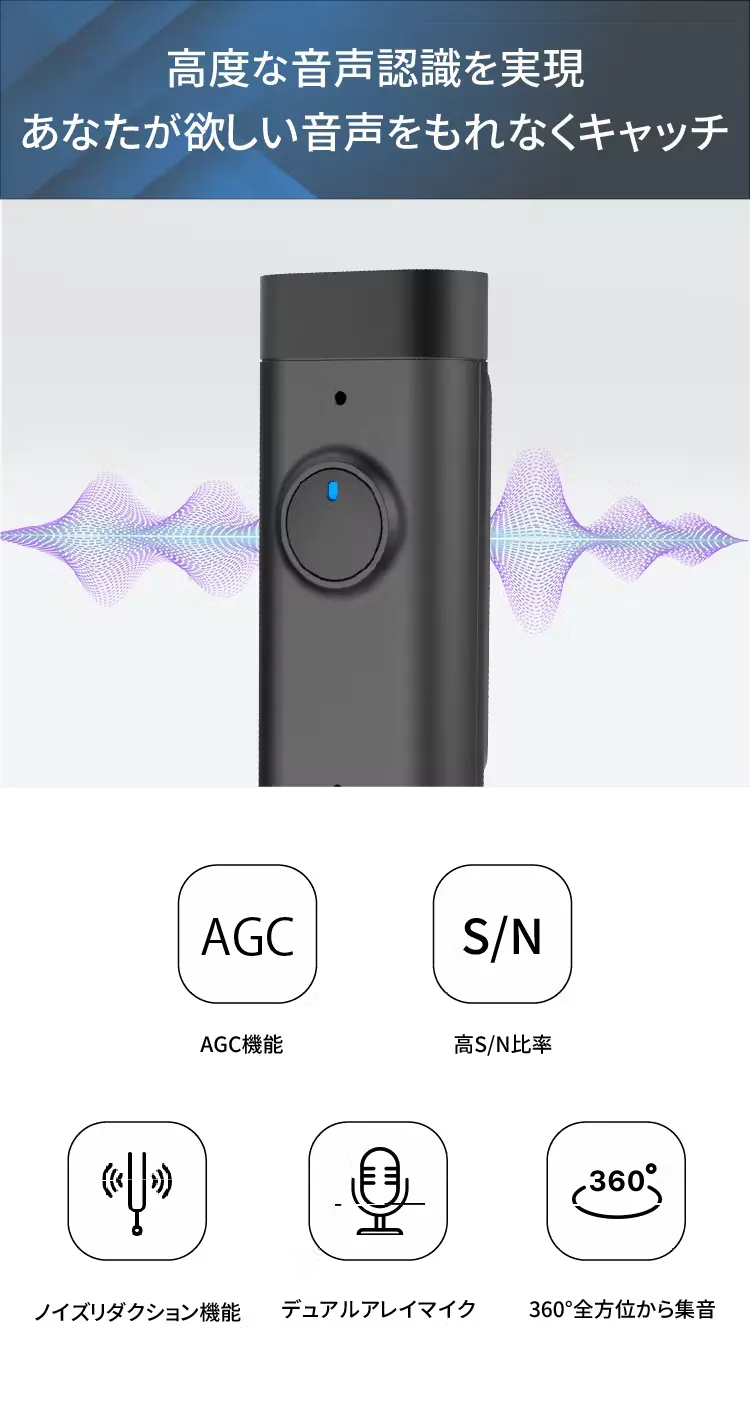 録音をしてもクリアな音声が取れてないと意味がありません。高精度な録音をするためにAGC(オートマチックゲインコントロール)、高S/N比、ノイズリダクション、デュアルアレイマイク、360°からの集音を実現し、あなたが聞きたい音声を漏れなく録音します。