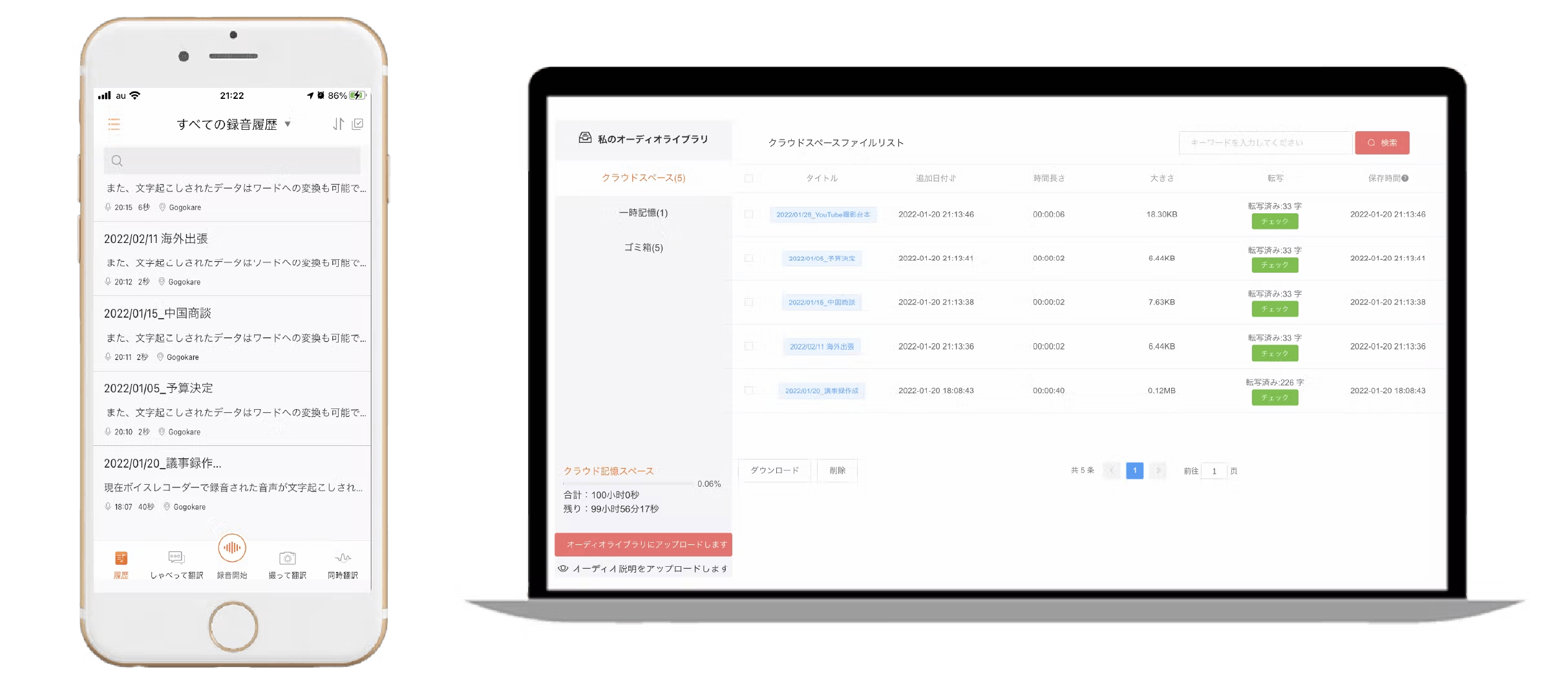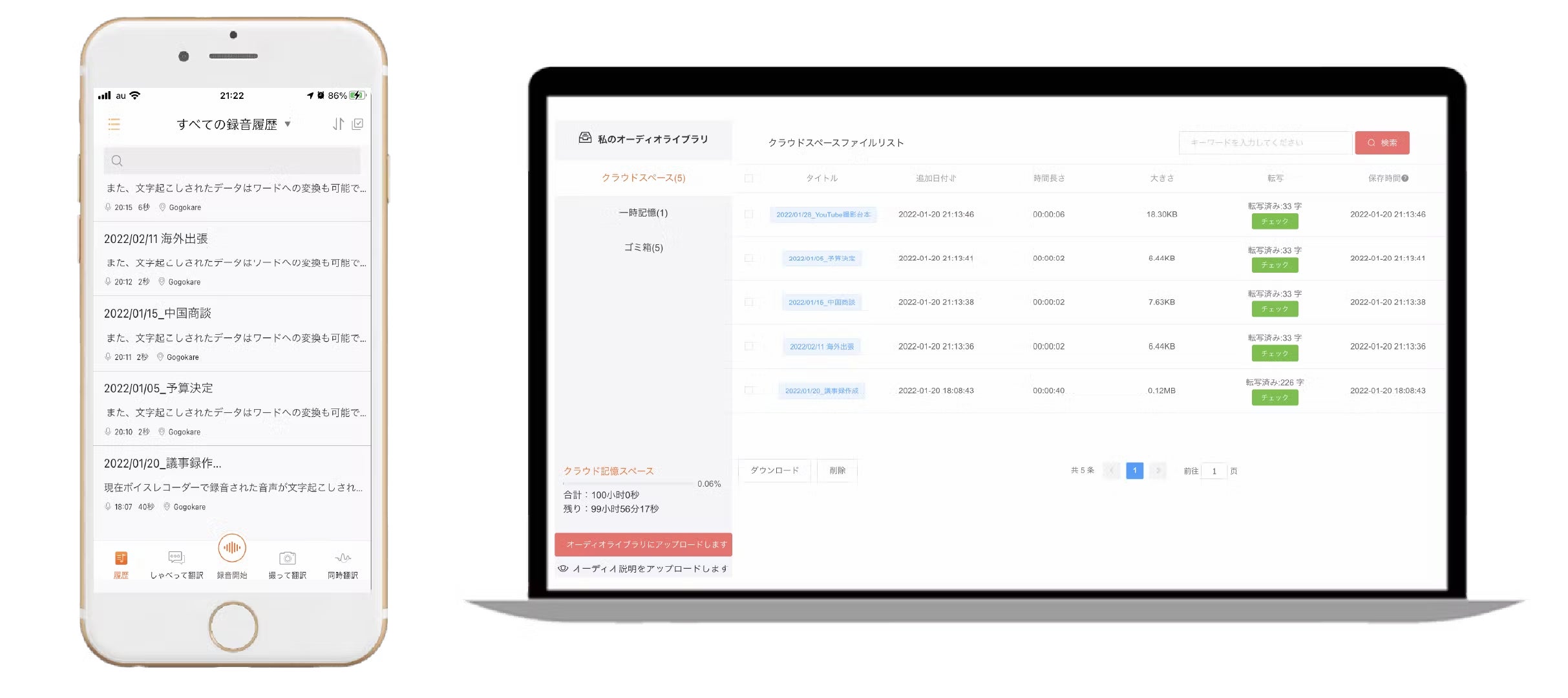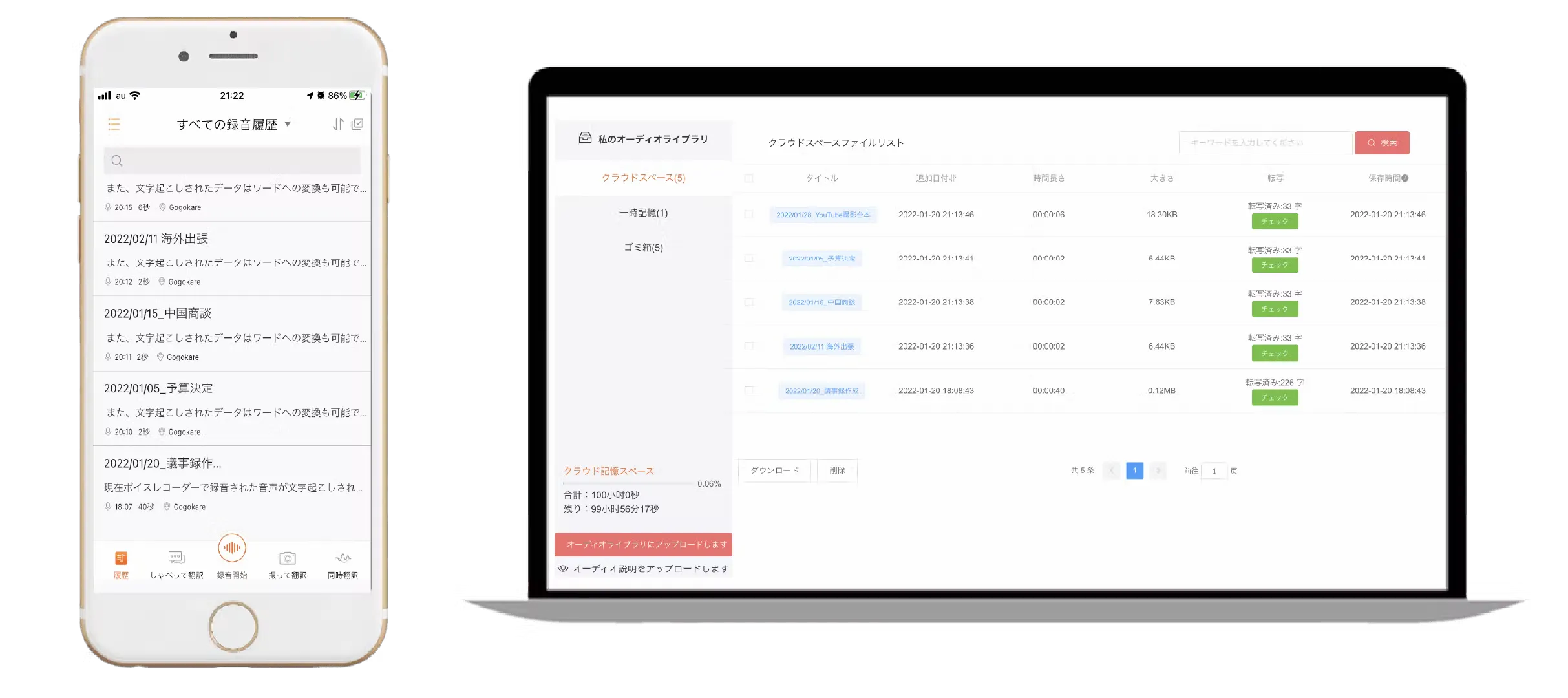録音データは専用のクラウドストレージ上に管理できます。最大容量は約100時間の音声データを保存できる大容量。ファイルに名前をつけることができるので取り出したいデータを直ぐに取り出せます。