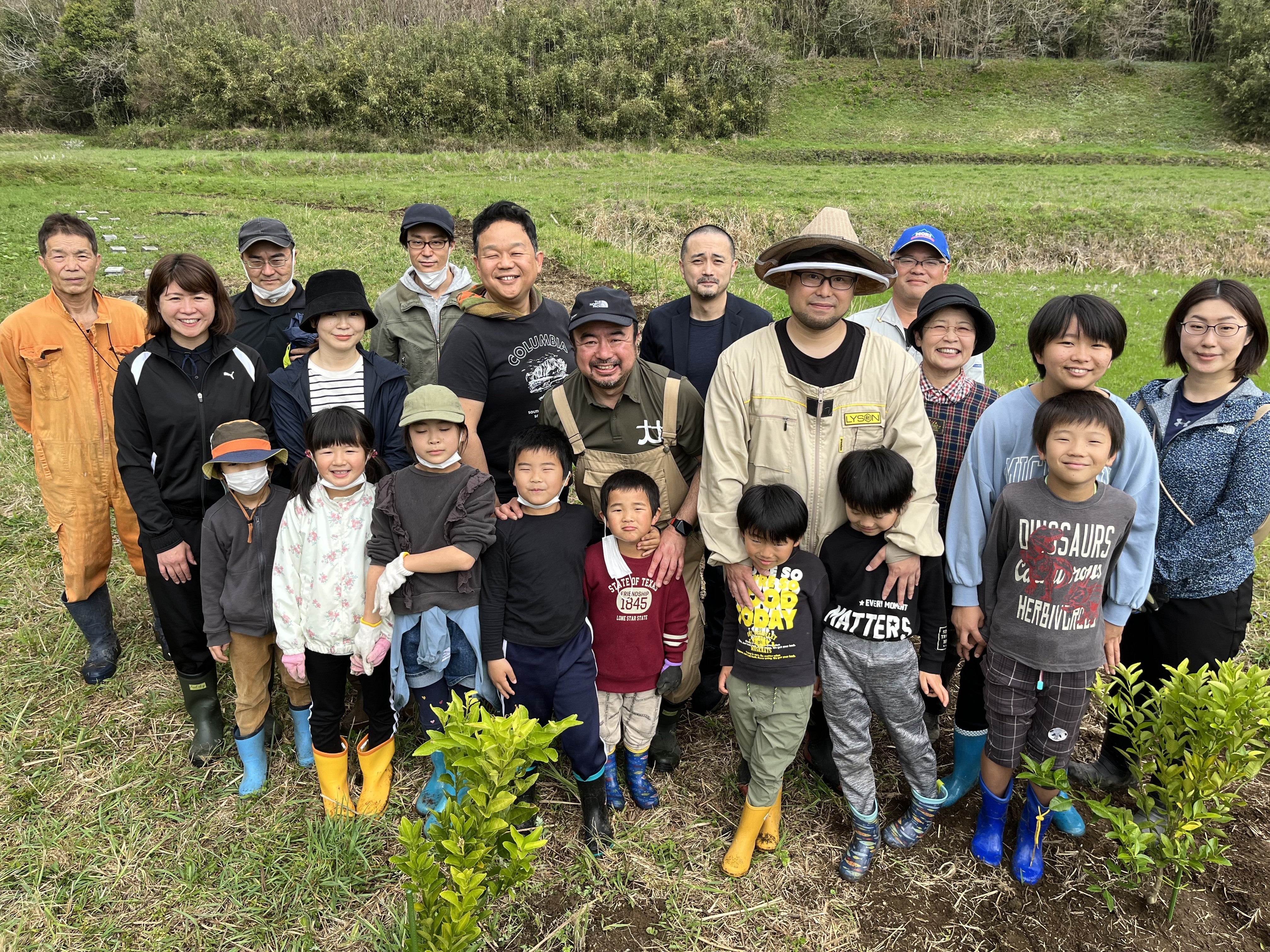 ご報告 奥霧島みつばちの木プロジェクト植樹祭が3月25日に開催されました!実は植樹祭は3月21日の予定でしたが、雨天により延期となりました。当日3月25日も前日まで雨予報がでており、開催できるか非常に心配しましたが、曇天の中、子ども9名を含めた15名の参加者と三代目齊藤養蜂場の齋藤さん、ムラタ拉麵の村田さん、たかはる古民家カフェの鈴木さんと共に植樹を行う事ができました。最初に村田さんの畑にへべす15本を植樹し、その後、齊藤さんの畑に町木であるタチバナ20本を植樹しました。子どもたちも、自ら進んでシャベルを持ちニコニコ笑顔で土にふれながら植樹を行っていました。また、植樹後は試飲会として、クラフトコーラ、へべすジュースの振る舞いがあり、へべすジュースには齊藤養蜂場のハチミツを混ぜて頂きました。子どもたちにはちみつが大人気で3杯おかわりした子もいました。子どもたちも 卒業や進級の節目など、それぞれ記念樹にもなりました。また、植樹を通して地域課題にふれながら、郷土愛を育む事が出来たのではないかと思います。弊社、奥霧島地域商社ツナガルたかはる株式会社にとりましても、昨年3月25日が会社設立日であり、設立丸1周年に植樹祭が行うことができ、感慨深い日となりました。2年目、3年目と木の成長と共に、これからも子どもたちや町民の方々と一緒に地域課題解決につながっていけるような取り組みを行っていきたいと思います。皆様からの心温まるご支援があって、このように奥霧島みつばちの木プロジェクト植樹祭が無事に開催できました。心から感謝申し上げます。引き続き、三代目齊藤養蜂場、ムラタ拉麵、たかはる古民家カフェ、高原町の応援をしていただければ幸いです。