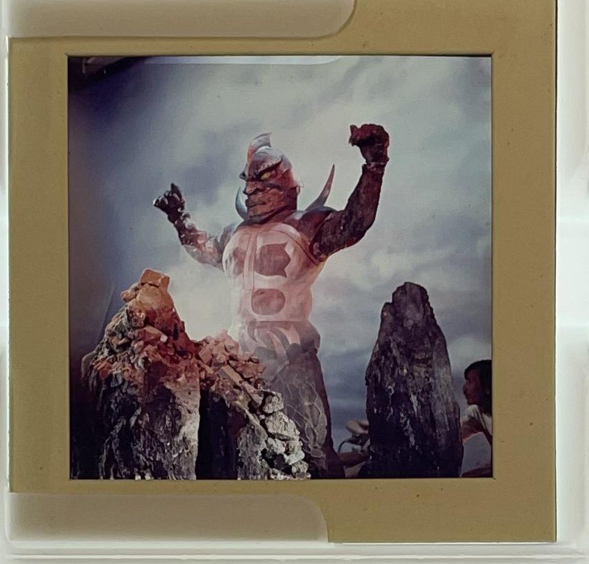 ミニチュア撮影の様子。おそらく第27話「大魔王ゴースン怒る!」で、ゴースンが巨大化しゴースン島を突き破って登場する場面だろう。ゴースンのアクターは遠矢孝信。完成映像より右に寄ったアングルのためか、右側にスタッフが写り込んでおり、まさに「見えてはいけない」舞台裏の一枚。